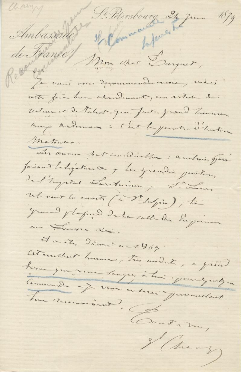 Dans cette brève missive, Chanzy recommande chaleureusement à son ami un peintre d’histoire ardennais, Louis Matout, l’incitant à lui passer quelques commandes :