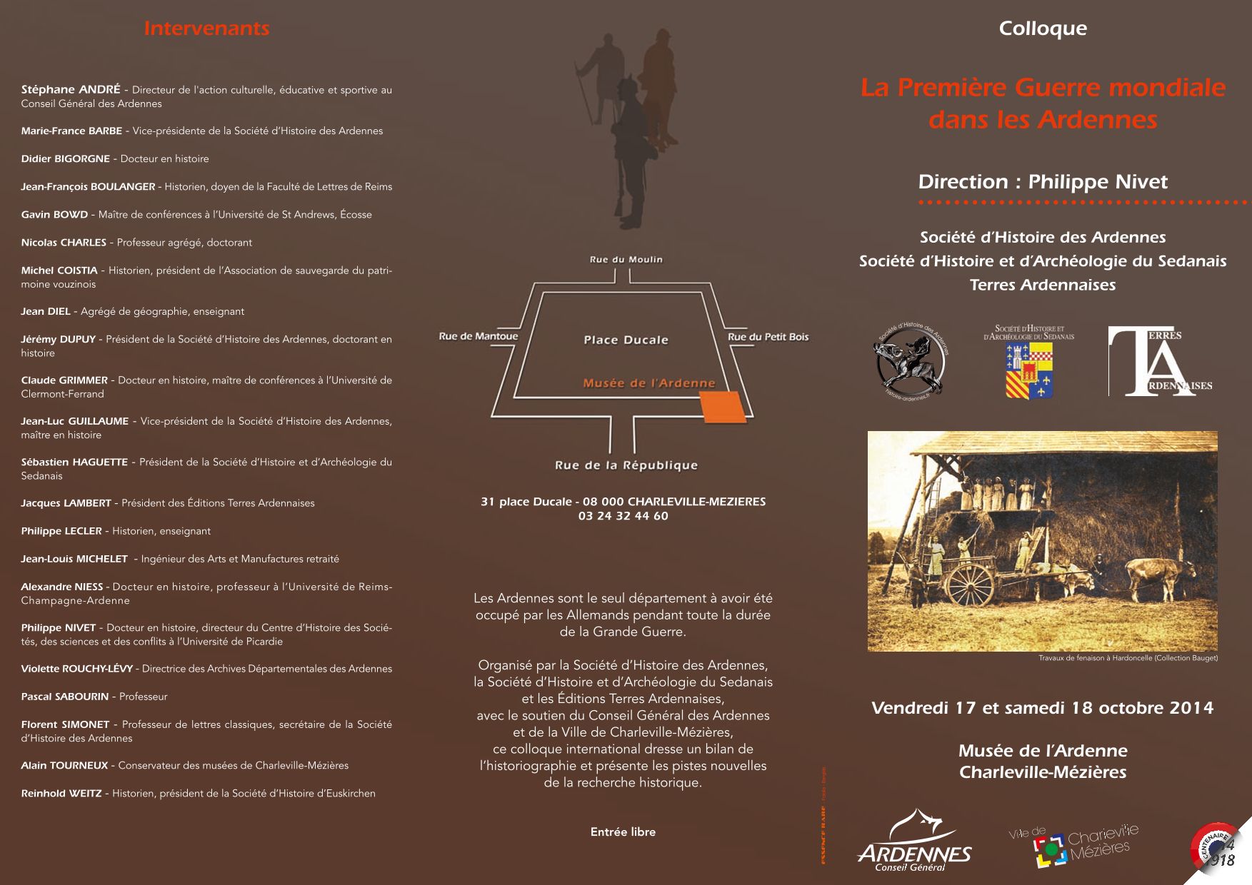 Dans le cadre des commémorations du Centenaire de la Grande Guerre, le Conseil Général des Ardennes, la Ville de Charleville-Mézières, la Société d’Histoire des Ardennes, la Société d’Histoire et d’Archéologie du Sedanais et les Éditions Terres Ardennaises sont heureux d’annoncer la publication d’un ouvrage de synthèse et l’organisation d’un colloque scientifique sur la Première Guerre mondiale dans les Ardennes. Ce double événement a reçu le label de la Mission nationale du Centenaire.