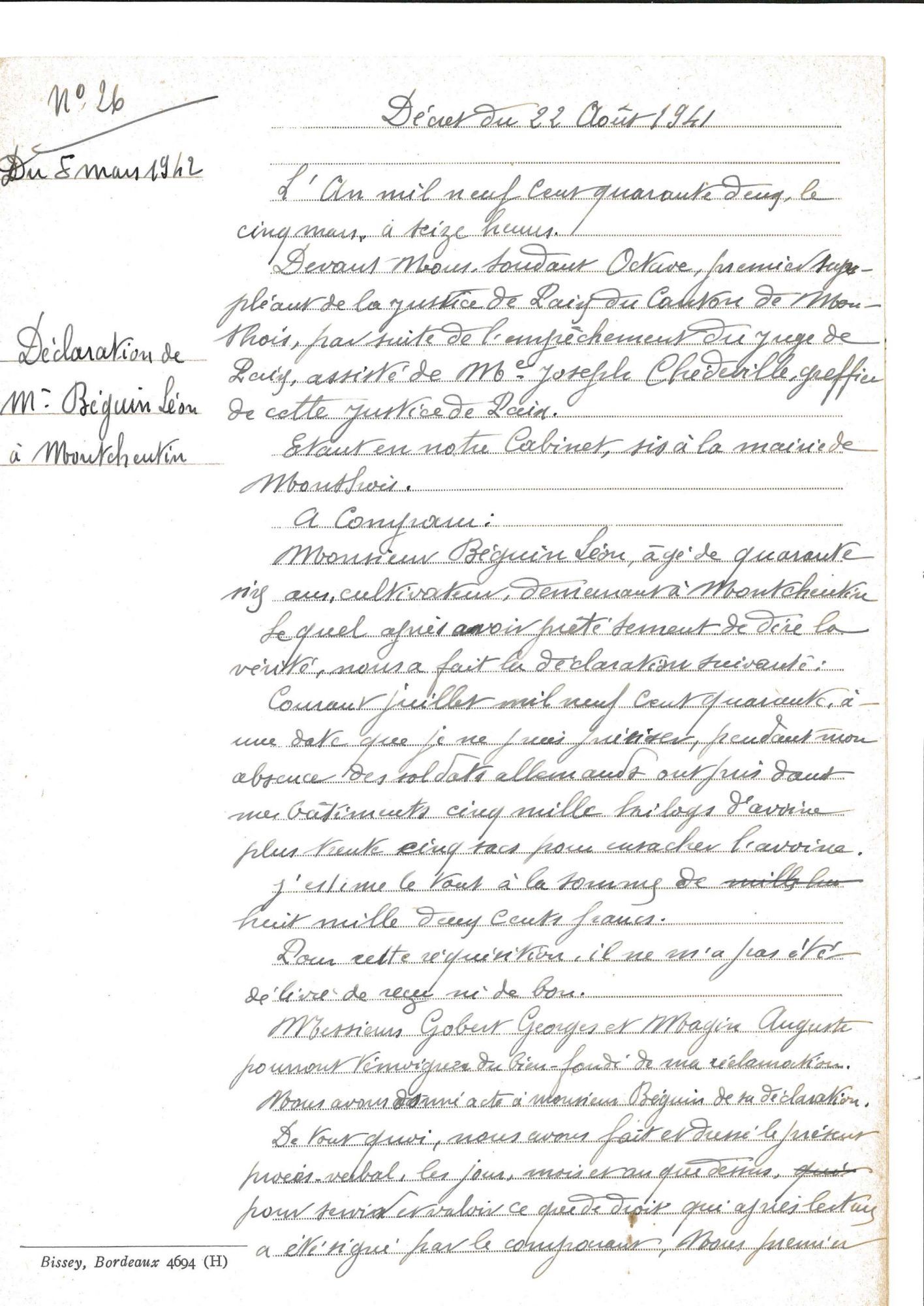 C’est un décret du 22 août 1941 qui prescrit la déclaration devant le juge de paix des « réquisitions allemandes n’ayant pas donné lieu à délivrance de bon ou de reçu et par les témoins desdits réquisitionnés ». On trouve ainsi les formulaires de déclarations en mairie accompagnés des minutes de déclaration et de déposition des témoins devant le juge de paix.
