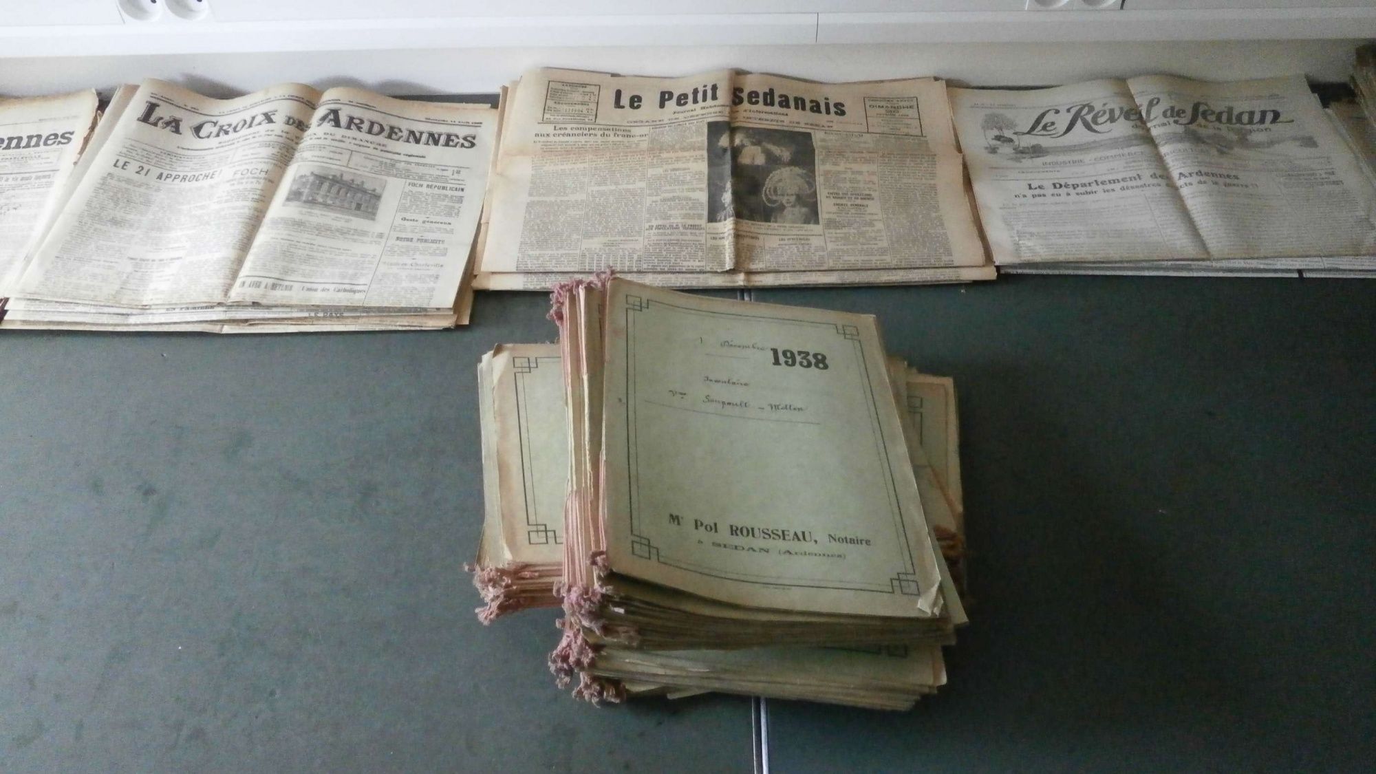 Très récemment, dans le fonds d’une étude notariale de Sedan, un nombre assez conséquent de journaux des années 1920 et 1930 a été retrouvé : le Cri de Sedan, le Réveil de Sedan, les Affiches Ardennaises des Sociétés, le Petit Sedanais… ces journaux, qui témoignent, à côté de la minute, de la publicité de l’acte, n’ont pas vocation à être conservés dans les fonds publiques. Ils vont ainsi en être extraits et combler les lacunes de la bibliothèque.