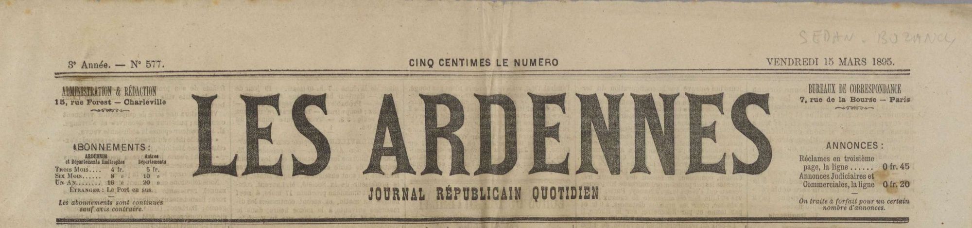 Parmi ces journaux, certains méritent d’être mis en lumière. Le journal Les Ardennes, par exemple, est un journal républicain quotidien qui paraît de 1893 à 1903, son siège se situe rue Forest à Charleville. En conflit avec Le Petit Ardennais, le ton employé par les rédacteurs est beaucoup moins châtié qu’aujourd’hui. Surnommant son concurrent le pétard et critiquant sa qualité rédactionnelle, les articles du journal Les Ardennes regorgent de faits divers, idéal pour trouver trace d’un décès par accident, meurtres, vols, incendies, rixes… originalité également de ce journal, les nombreux articles consacrés à la guerre de 1870, notamment la liste des habitants de Bazeilles blessés ou disparus lors des combats du 31 août et 1er septembre 1870.