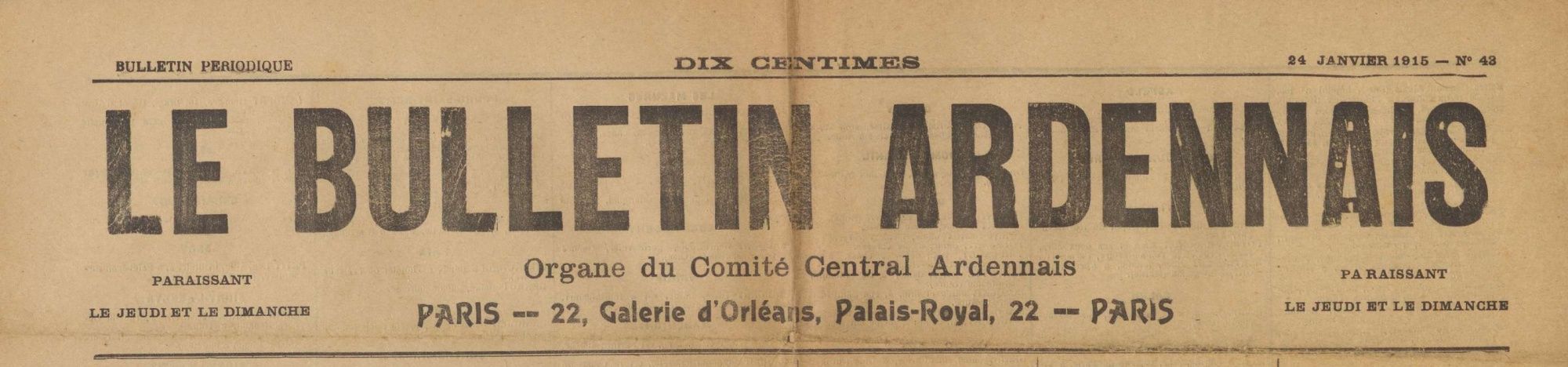 Nouvellement entré dans les collections de la bibliothèque patrimoniale des Archives, Le Bulletin ardennais est un journal bihebdomadaire de la Première Guerre mondiale. Regroupant des informations concernant le département et ses habitants, il paraît à Paris pendant toute la durée de la guerre et traite de sujets très variés et inédits : situation des villages et des habitants des Ardennes occupées, récits de prisonniers civils et militaires, nécrologie de soldats ardennais ou de réfugiés, liste de prisonniers et de rapatriés, organisation des Ardennais dans la capitale… il s’agit de renseignements précieux pour tous les chercheurs en histoire et en généalogie.