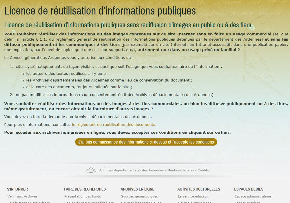 Afin de faciliter l’usage du portail internet des Archives départementales, la licence clic a été désactivée. Attention cependant, le règlement demeure en vigueur et se doit d’être appliqué pour toute réutilisation de documents issus des collections publiques des Archives départementales. Vous pouvez retrouver les informations de réutilisation dans la rubrique de présentation des archives en ligne.