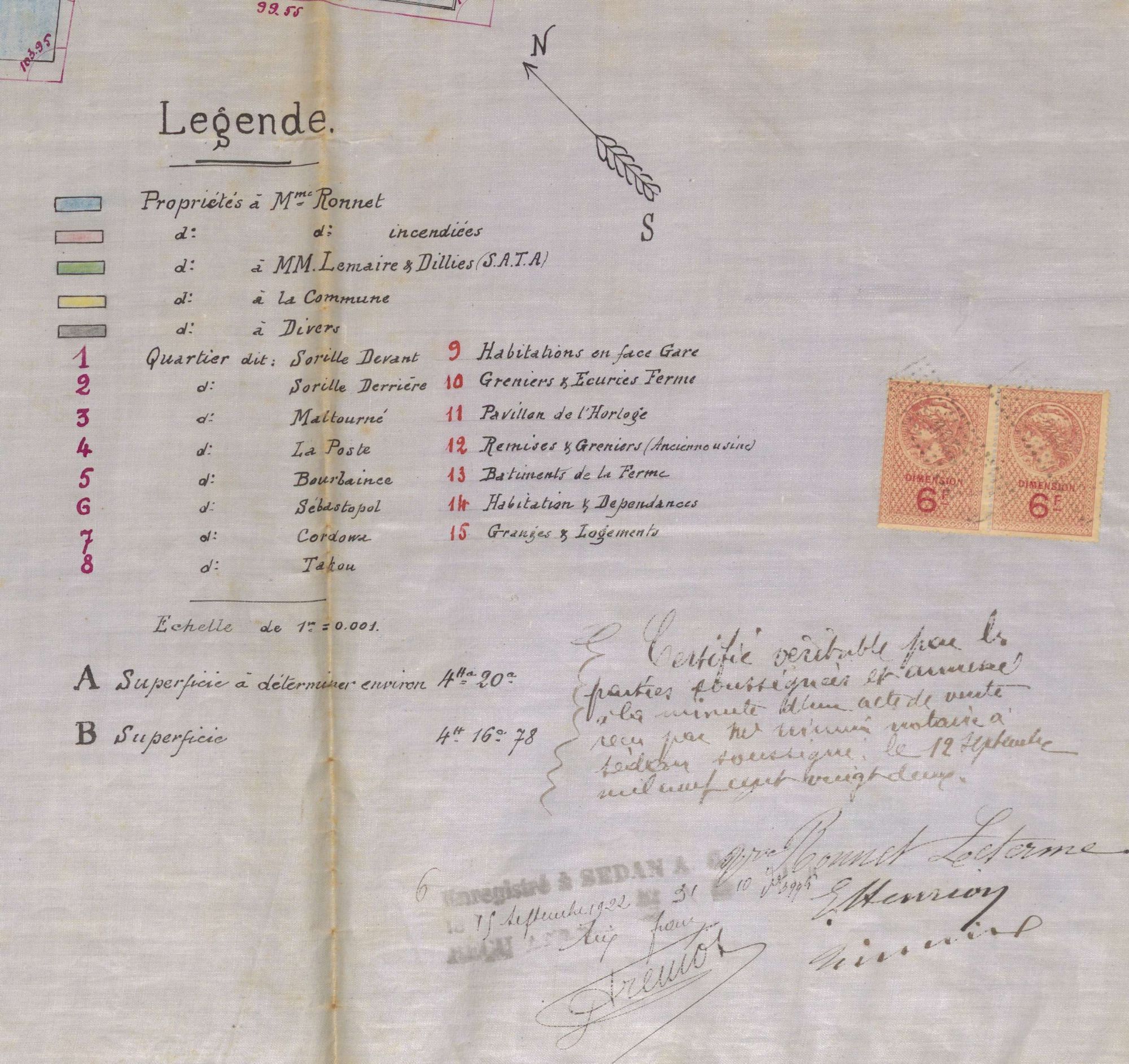 Parmi les documents conservés dans ce fonds classé 3E 44 , il a été retrouvé un acte illustré d’un plan aquarellé d’assez grand format (90cm X 90cm). Ce plan est de jolie facture, et il permet également de mettre en lumière l’histoire de la reconstruction de la région sedanaise au lendemain de la Première Guerre mondiale. Daté de 1922, il s’agit d’un plan annexé à la vente de biens par Madame Veuve Ronnet à la Société anonyme textile ardennaise (SATA). On y découvre ainsi une usine de filature au centre, à laquelle sont annexées de chaque côté, deux parcelles (A et B) d’une superficie totale de plus de 8 hectares. Nous sommes à Pont-Maugis et la filature de la SATA absorbe alors les biens détenus par les héritiers de la filature de laine cardée Ronnet, augmentant de façon considérable son emprise foncière et demeurant ainsi le poumon économique de Pont-Maugis. Les biens de la SATA sont en vert, ceux de la vente de la Veuve Ronnet sont en bleu, en jaune sont mentionnés les biens communaux et en rose les biens incendiés. En effet, avec cette vente, la Veuve Ronnet cède également ses dommages de guerre, ce qui signifie qu’elle donne, avec la vente des biens, le montant de dommages de guerre concédé par l’État pour la réparation des biens détruits lors du premier conflit mondial.