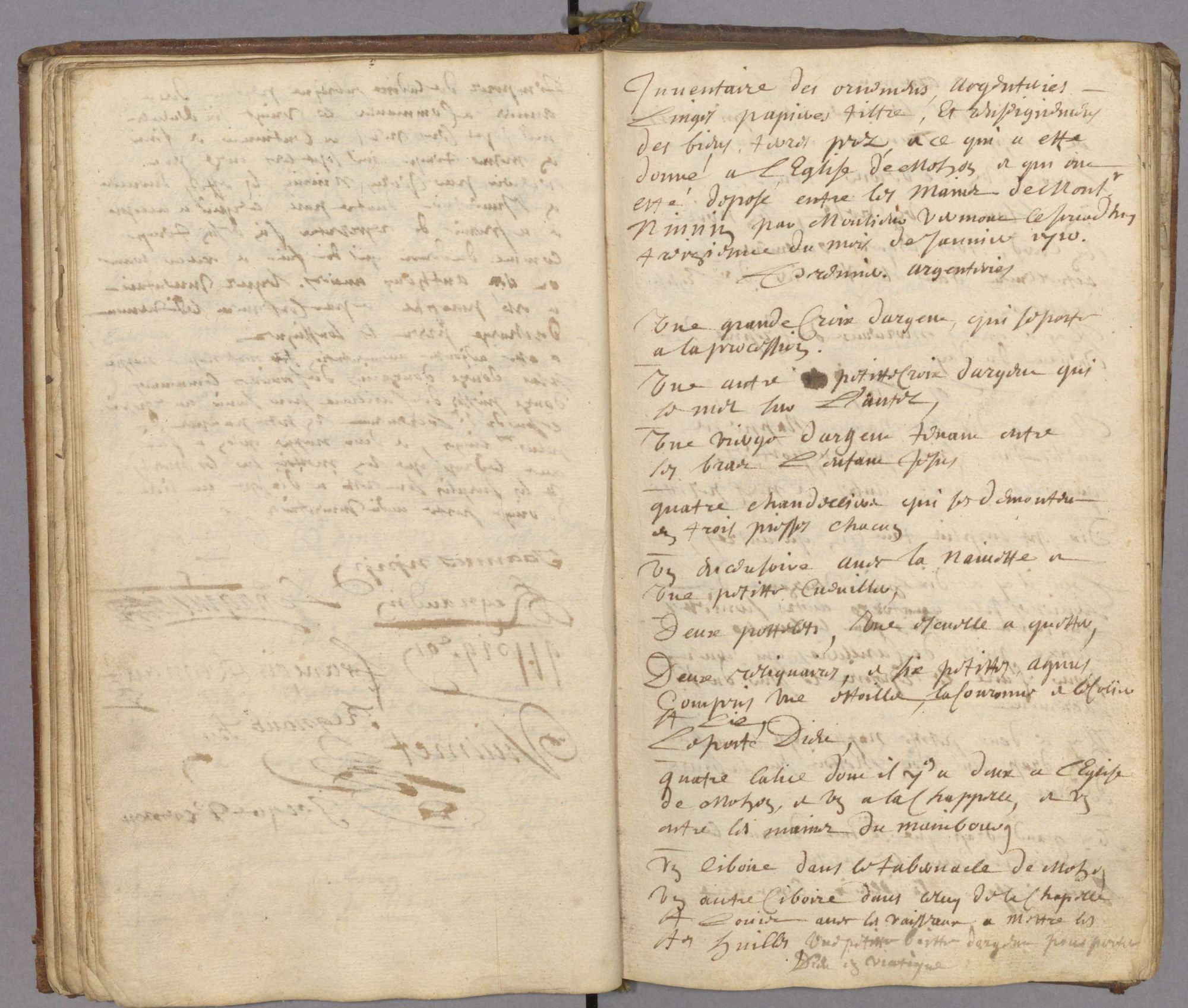 Responsable de biens mobiliers de la fabrique, le marguillier dresse tous les deux ans lorsqu’il transmet sa charge à un nouveau marguillier un « inventaire des ornements, argenteries, linges, papiers et titres » appartenant à l’église de Mohon. Ces inventaires rédigés sans interruption de 1688 à 1784 constituent l’essentiel du registre.