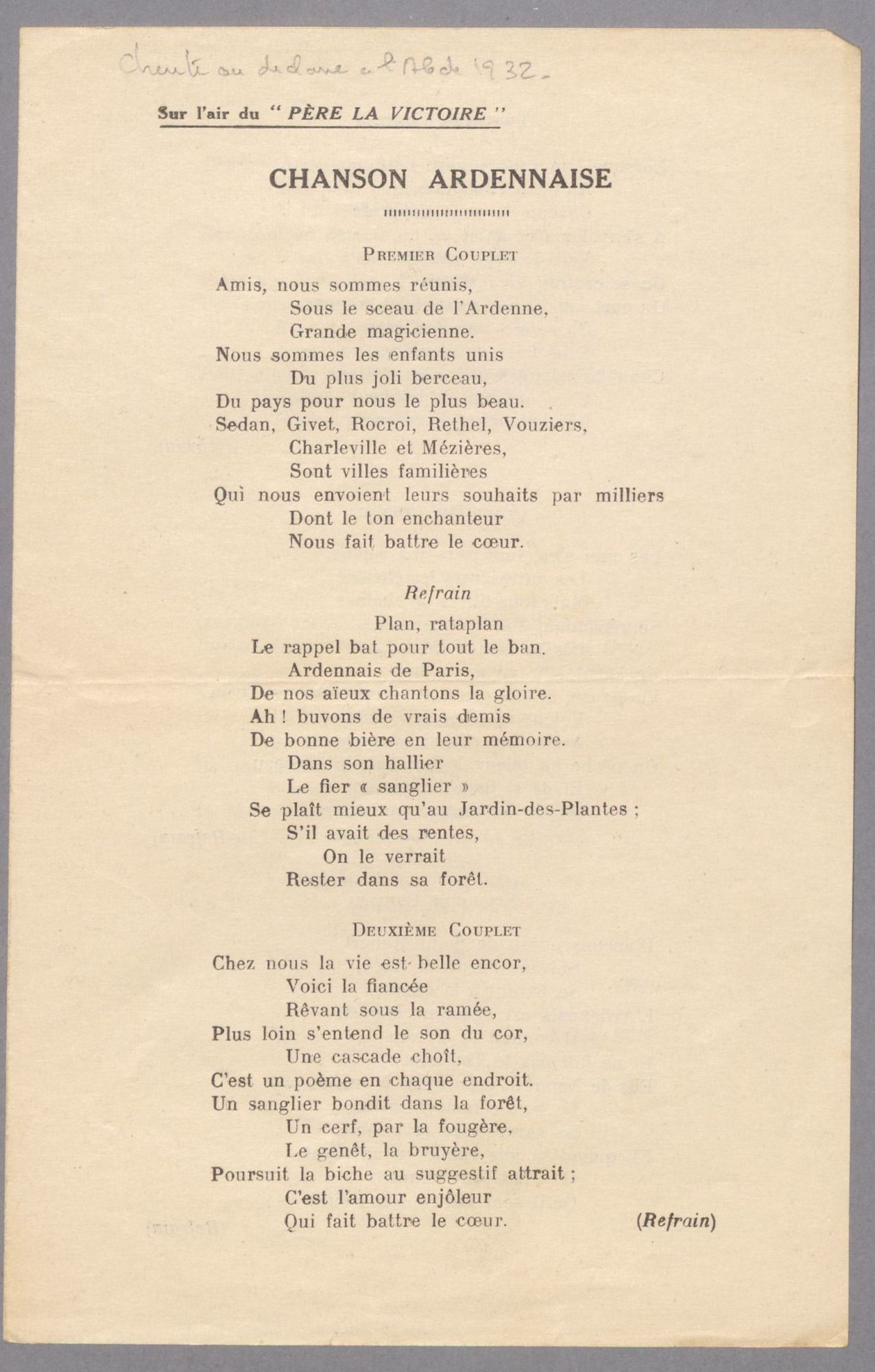 Les quelque trois mètres linéaires de documents entrés dans nos collections font très bien revivre cette histoire ardennaise, notamment par l’intermédiaire de partitions, comme celle présentée ci-contre. Chantée lors de l’assemblée générale de 1932, elle démontre bien l’attachement de ses membres aux Ardennes.