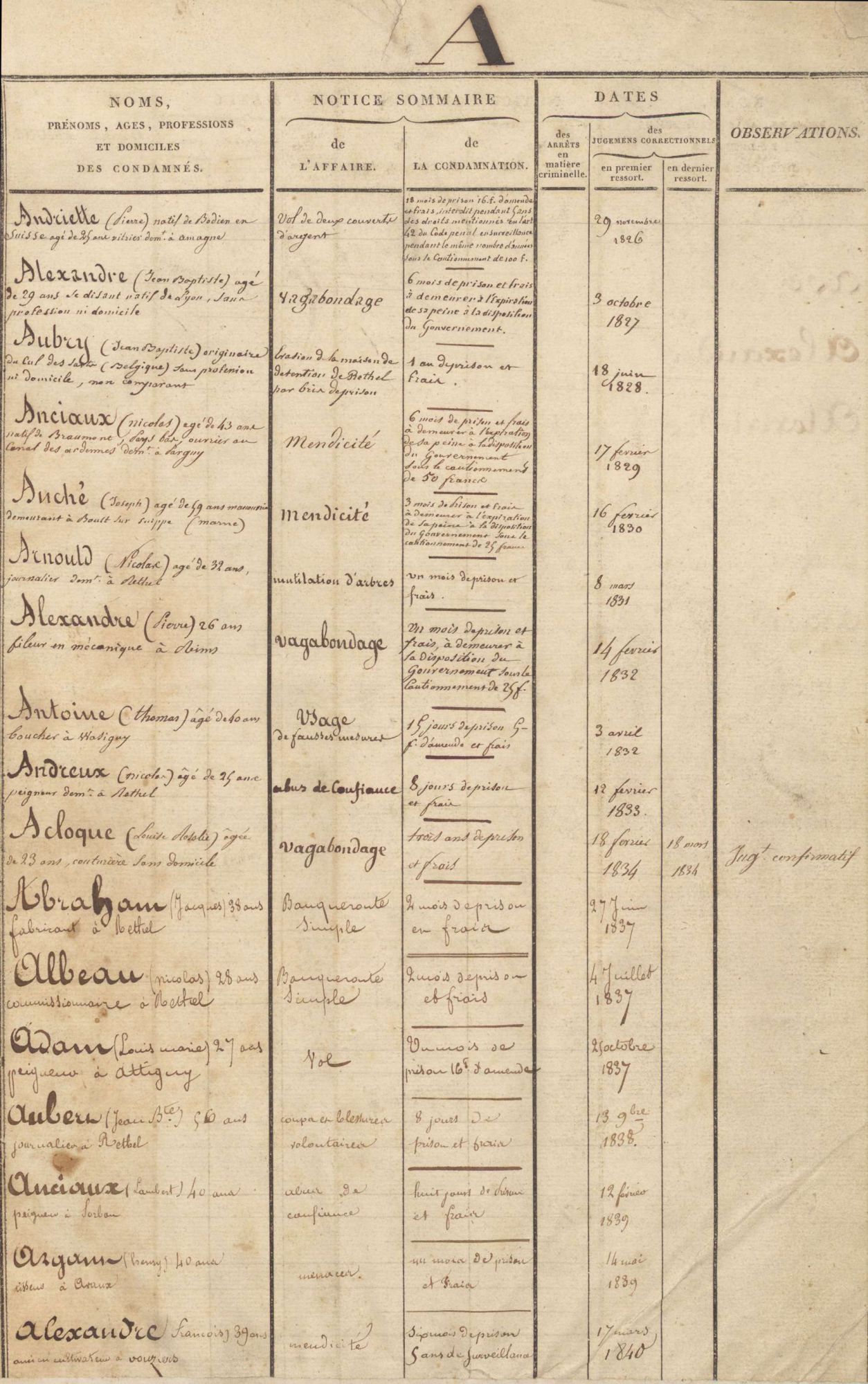 À sa lecture, on s’aperçoit que les renseignements sur les condamnés sont bien détaillés : quatre colonnes sont ainsi présentes. La première est dédiée à l’identité du condamné, son origine géographique, son âge, son domicile et sa profession. On y découvre que les prévenus viennent plutôt des alentours de Rethel mais aussi du département des Ardennes, de la France entière, mais également de l’étranger. Les professions sont très différentes, on passe du simple commerçant au cultivateur, voire au marchand. On y trouve en nombre des peigneurs de laine, car se trouvait à Rethel même et aux alentours plusieurs filatures importantes.