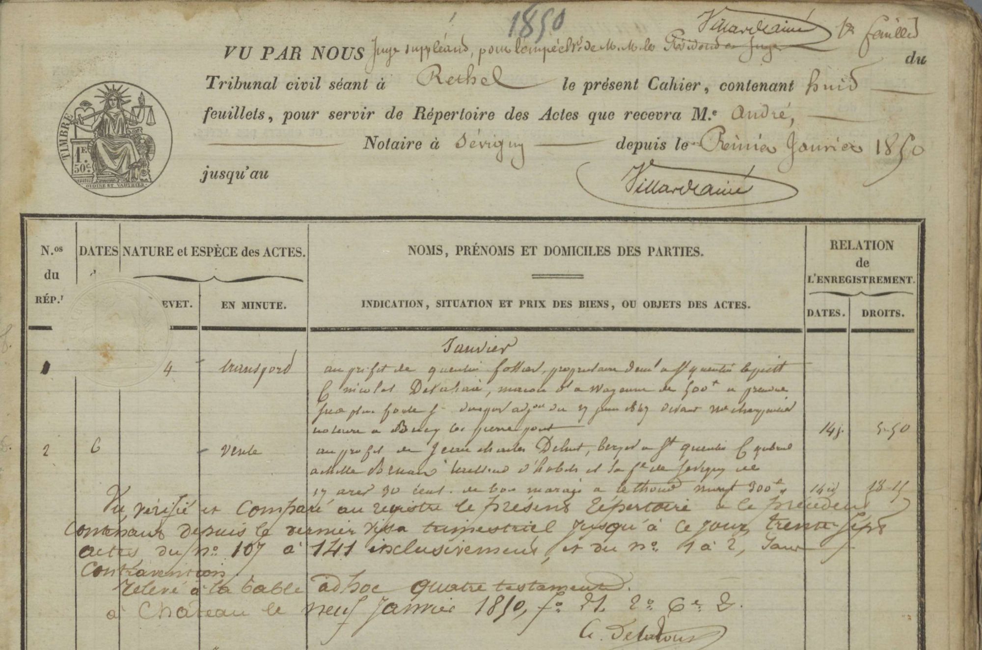 Les répertoires vous permettent d’accéder plus facilement aux actes eux-mêmes puisque chaque acte notarié a été collationné jour après jour avec mention des parties, du type d’acte, et de la date de l’acte. C’est la première étape de la recherche.
