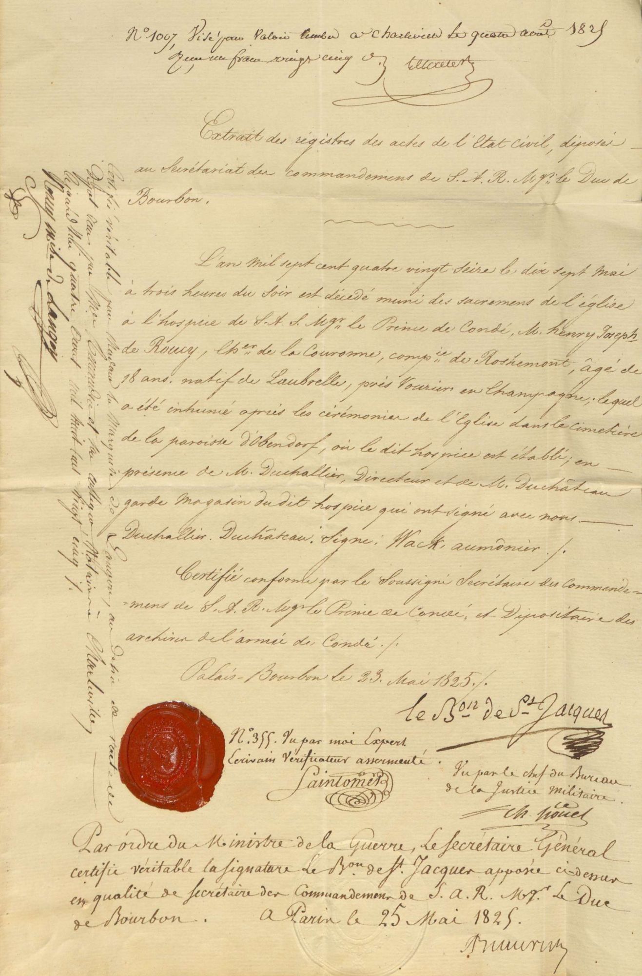 Ce document, hormis le fait de porter un sceau plaqué, est remarquable car cet extrait d’acte de décès est dressé en 1825 près de 30 ans après la mort d’Henry Joseph de Roucy. Nous voyons ainsi que les archives notariales, du fait du rôle central du notaire dans le règlement des successions, permettent de retrouver des informations sur un ancêtre décédé loin de son lieu de naissance, à une époque éloignée et plus particulièrement lors des périodes de guerre.