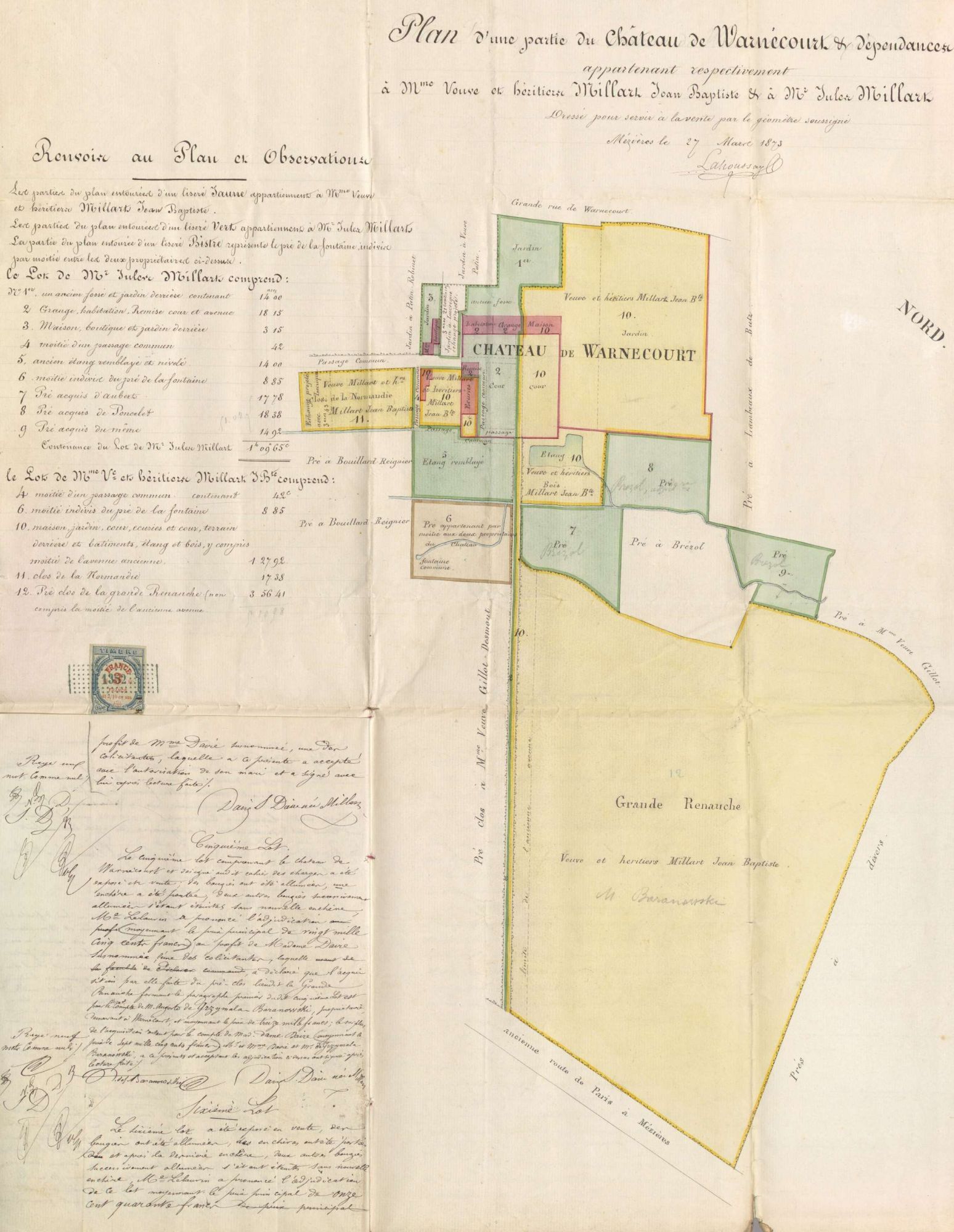 Un acte rédigé en 1873 dans le cadre de la vente du château de Warnécourt contient, par exemple, un plan en couleur de ce château et de son domaine (cote 3E1 385). Ce plan légendé indique la nature de chaque bâtiment (habitation, remise, grange…) mais donne aussi des informations sur des aménagements désormais invisibles comme l’emplacement d’un étang remblayé ou d’un ancien fossé.
