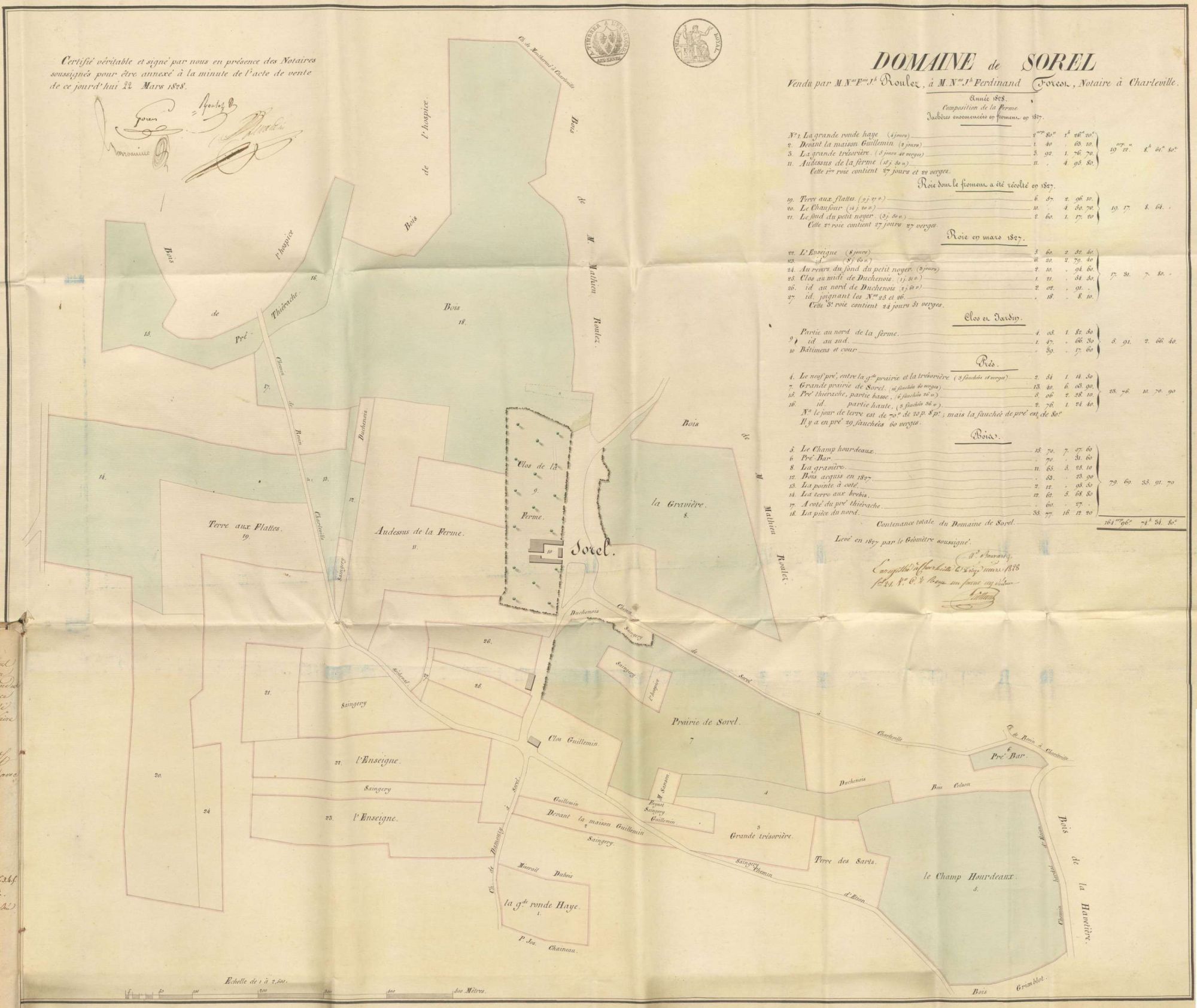 Le deuxième plan a avoir retenu notre attention par ses dimensions (75 cm sur 65 cm) est un plan entoilé en couleur réalisé en 1828 à l’occasion de la vente du domaine de Sorel à Damouzy (cote 3E1 288). L’acte notarié auquel il est annexé décrit en détail les différentes parties du domaine et en fait l’historique depuis qu’il a été érigé en fief par le duc de Mazarin en 1726.