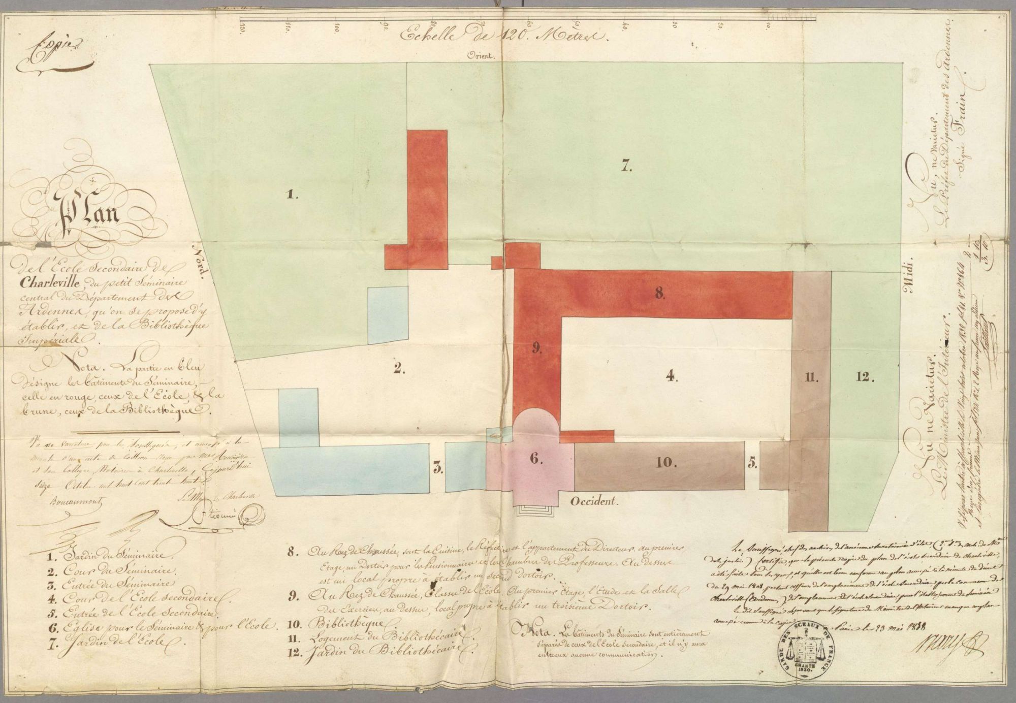 Un dernier plan remarquable par sa description de l’organisation interne d’un bâtiment a été découvert joint à l’acte de cession en 1838 par la ville de Charleville à l’archevêché d’une partie d’un bâtiment pour y installer un petit séminaire (cote 3E1 300). Ce bâtiment situé actuellement sur le coté est de la place Jules Félix (cote 3E1 299) abritait avant la Révolution le couvent des Sépulchrines. Le plan permet de découvrir de quelle manière l’ancien couvent avait été divisé pour accueillir, outre le petit séminaire, la bibliothèque et l’école secondaire de Charleville.