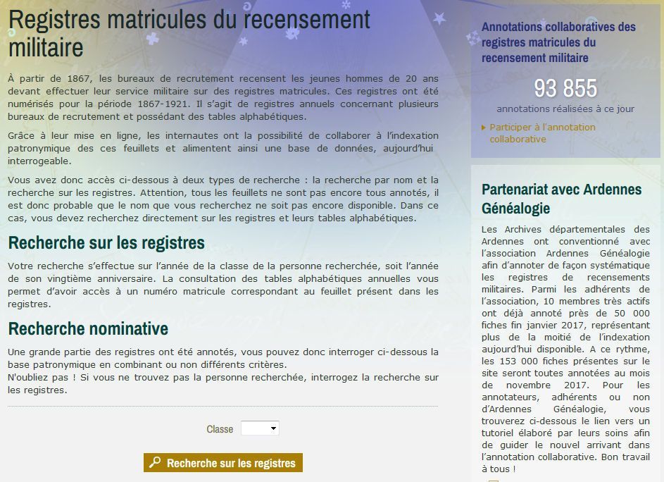 Après plusieurs rencontres et entretiens, les Archives départementales et Ardennes généalogie ont mis en œuvre une convention de partenariat relative à l’annotation collaborative des registres matricules militaires. L’association Ardennes généalogie s’est engagée bénévolement et gratuitement à tout mettre en œuvre afin d’indexer tous les registres matricules militaires disponibles en ligne (de 1867 à 1921). Un tutoriel a été réalisé permettant à leurs bénévoles mais également à tous les annotateurs, de bénéficier d’un guide et de conseils pour mener à bien l’annotation.