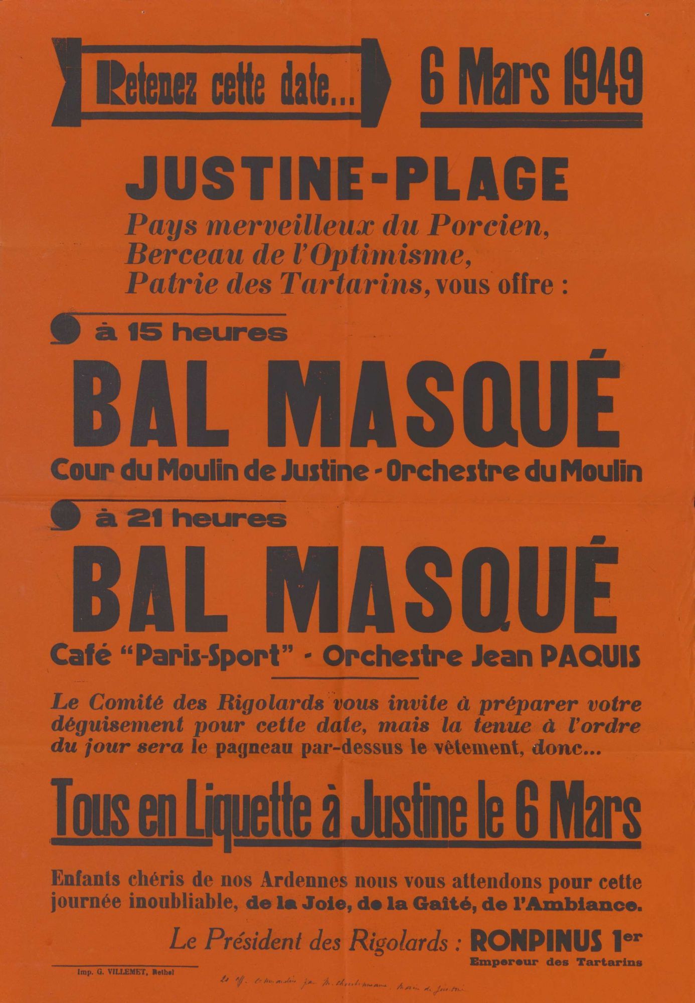 En ce mois d’août 2017, une collègue affairée à reconditionner une liasse de la sous-préfecture de Rethel (SP/RETHEL 194) a fait une découverte portant à sourire, que nous avons voulu vous faire partager : une affiche d’un orange bien soutenu annonçant « JUSTINE-PLAGE » devant se dérouler le 6 mars 1949. Les mots sont choisis et dégagent une certaine joie de vivre : on y parle du Porcien comme un pays merveilleux, berceau de l’optimisme et patrie des Tartarins… et la patrie des Rigolards y invite tous ceux qui le souhaitent à venir festoyer aux deux bals masqués organisés ce jour !