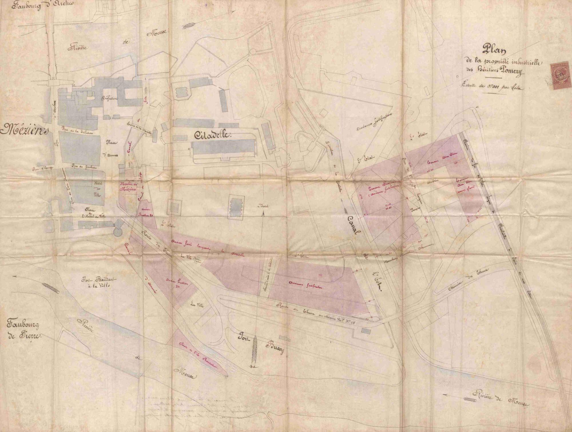 Ce document est une des pièces annexes d’un acte de vente conclu le 22 mai 1893 entre Henri Pommery, négociant en marc de Champagne à Reims, et Gustave Adolphe Clément, constructeur de vélocipède. Par cette vente, l’acquéreur, aussi connu sous le nom de Clément Bayard, devient propriétaire des ruines d’une ancienne usine hydraulique dite « Moulin de Mézières » située sur la place d’armes (actuellement la place de la préfecture) et incendiée suite au bombardement de Mézières le 31 décembre 1870. Il acquiert également les dépendances de l’usine constituées du canal d’amenée des eaux et d’anciens terrains militaires comprenant des bastions. Cette ruine deviendra par la suite la Centrale Mazarin qui alimentera en électricité les usines de la Macérienne.