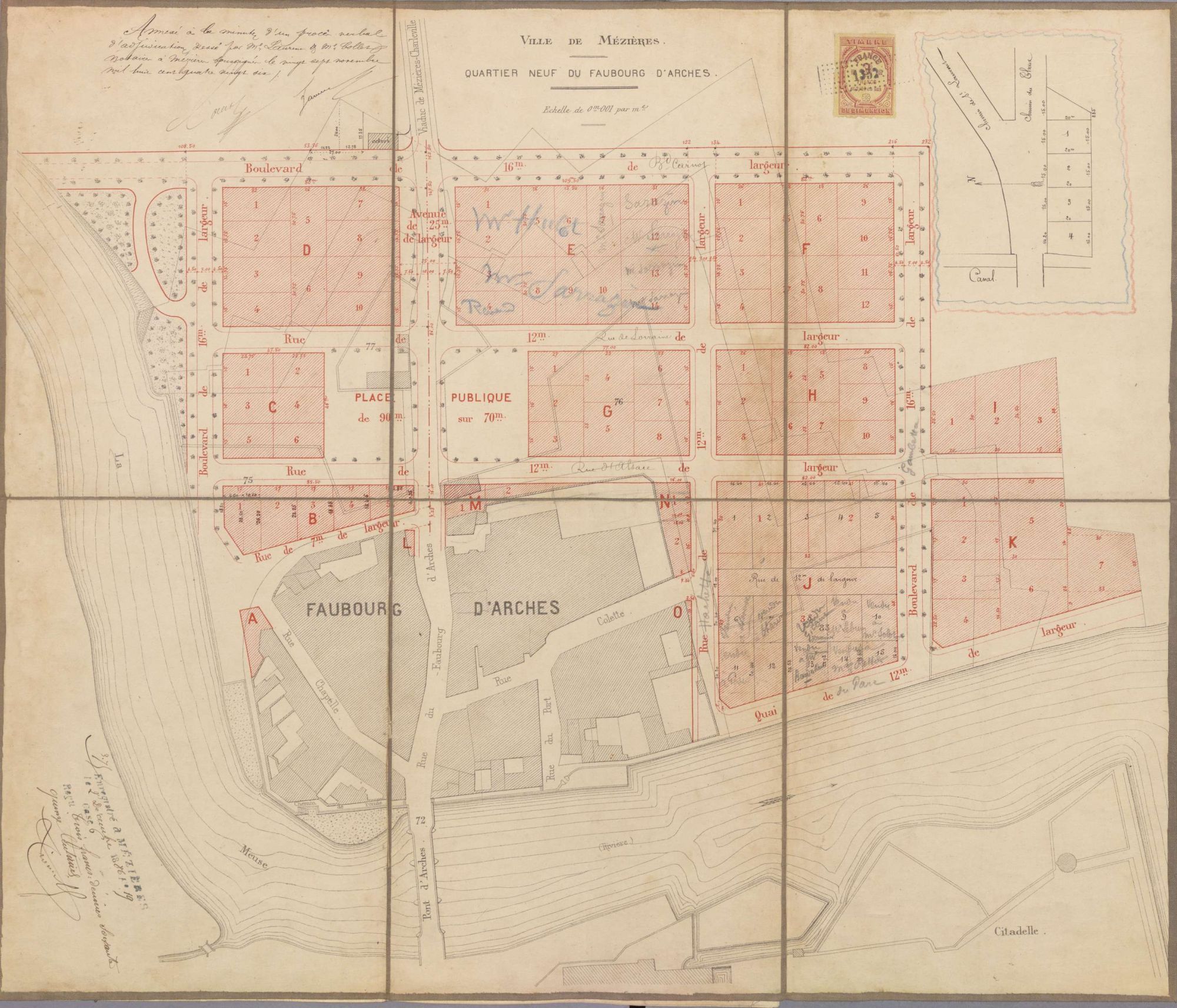 Le reclassement des archives des notaires de Mézières sont l’occasion de redécouvrir deux plans illustrant les importantes opérations d’urbanisme réalisées à Mézières à la fin du XIXe siècle et donnant un dernier aperçu sur des fortifications aujourd’hui disparues.