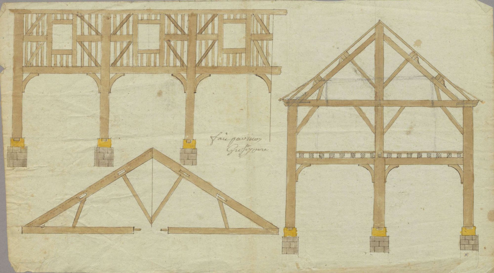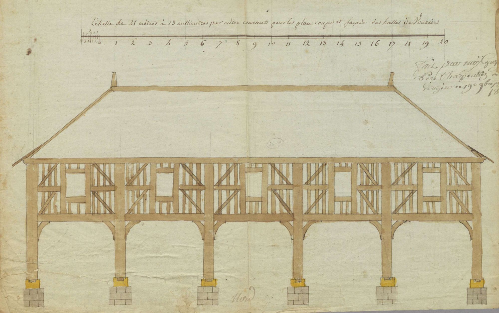 Conservés aux Archives départementales depuis 2008, des documents anciens ont réintégré les collections communales de Vouziers au mois de mars 2018. Il s’agit d’archives fort intéressantes relatives à l’église (1758-1781), au bâtiment de l’ancienne vicomté loué pour l’établissement du tribunal (an VII), à la construction d’écurie pour l’armée en 1817 et à la halle communale (1774-1808). Parmi les nombreux documents écrits, des croquis de la halle de Vouziers attirent particulièrement l’attention. Datés de novembre 1808, ils sont bien conservés et accompagnés du « devis estimatif des ouvrages à faire et des matériaux à fournir pour la construction de deux corps de halles… pour l’année 1809. »