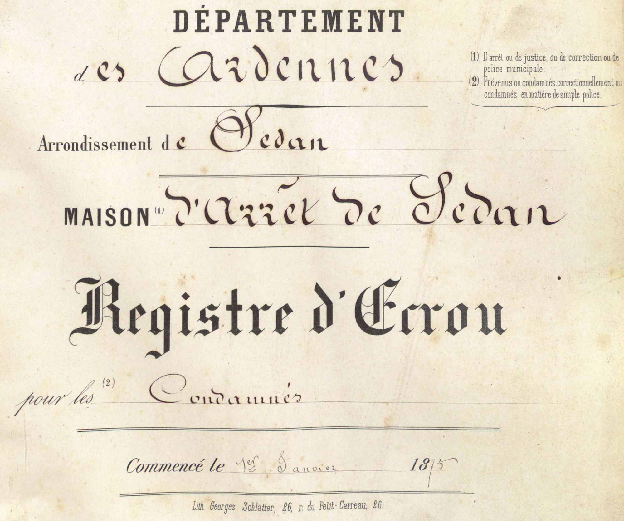 Composés pour l’essentiel de registres d’écrou dès les années 1910, les documents concernent les cinq établissements pénitentiaires qui existaient dans les Ardennes (Charleville, Sedan, Rethel, Vouziers et Rocroi) avec une distinction faite entre les maisons d’arrêt (prévenus attendant un passage en correctionnelle), les maisons de correction (condamnation correctionnelle de moins d’un an) et les maisons de justice (accusés devant passer en cour d'assises). Il est à souligner le registre d’écrou de Sedan remontant à 1875 ainsi qu’un registre de la prison de Charleville tenue par les autorités allemandes pendant la Seconde Guerre mondiale.
