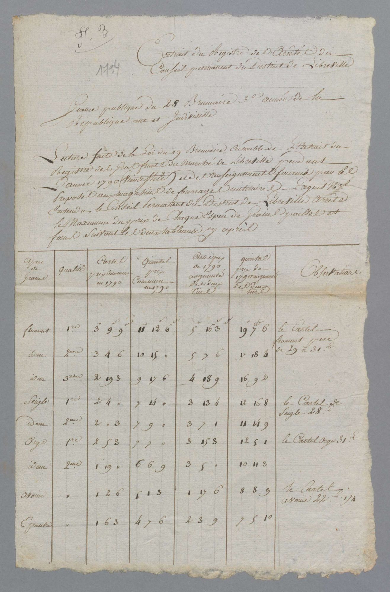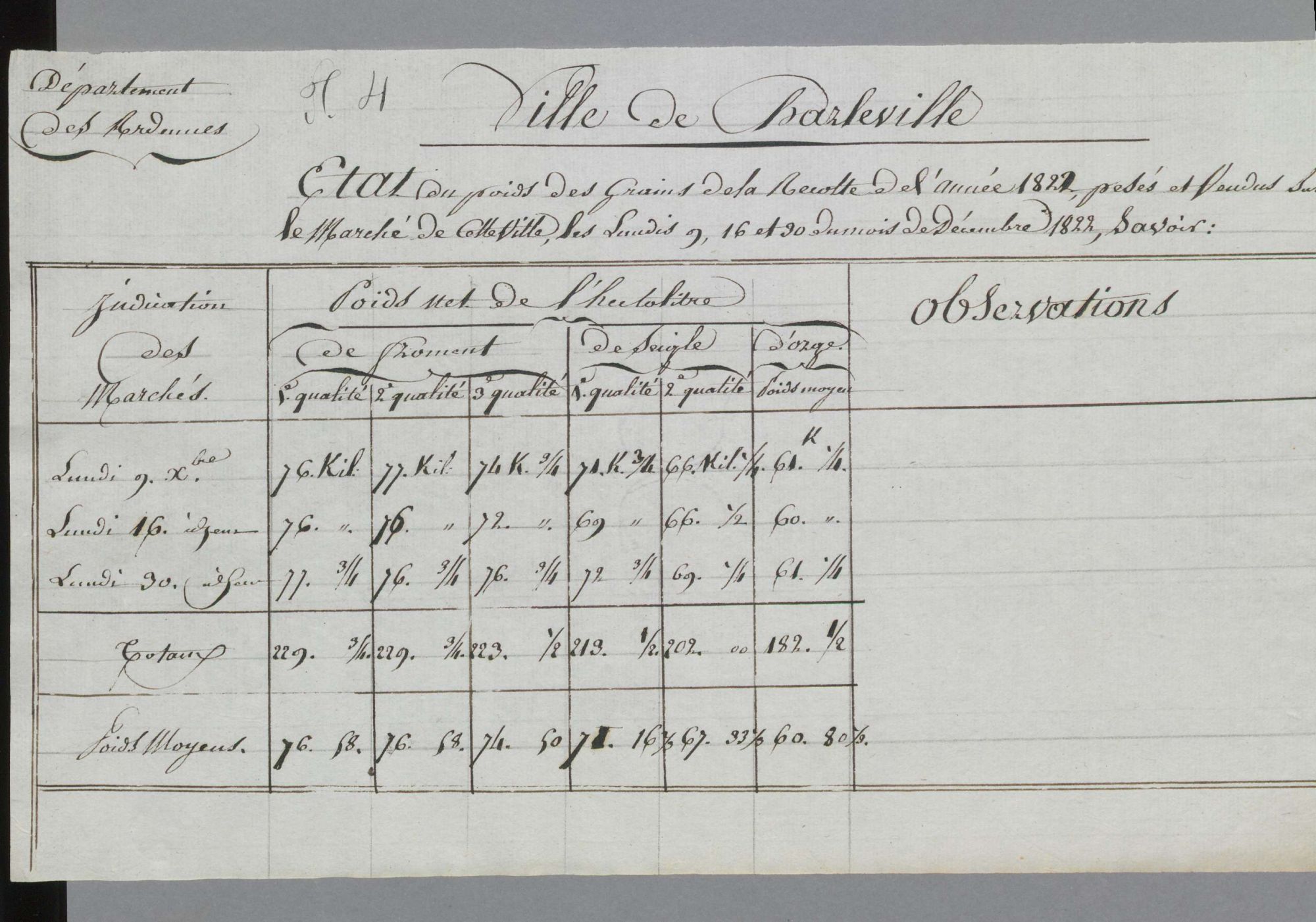 Une série impressionnante de mercuriales est conservée dans les archives communales déposées de Charleville aux Archives départementales sous la référence EDEPOT Charleville/4 F 4-117. Datant de 1794 à 1912, elles sont constituées des tableaux indiquant le prix et le cours des denrées vendues sur les marchés publics (désignation des produits agricoles : froment, seigle, orge et avoine ; comestibles divers : pain, viande, fourrages, bois à brûler…).