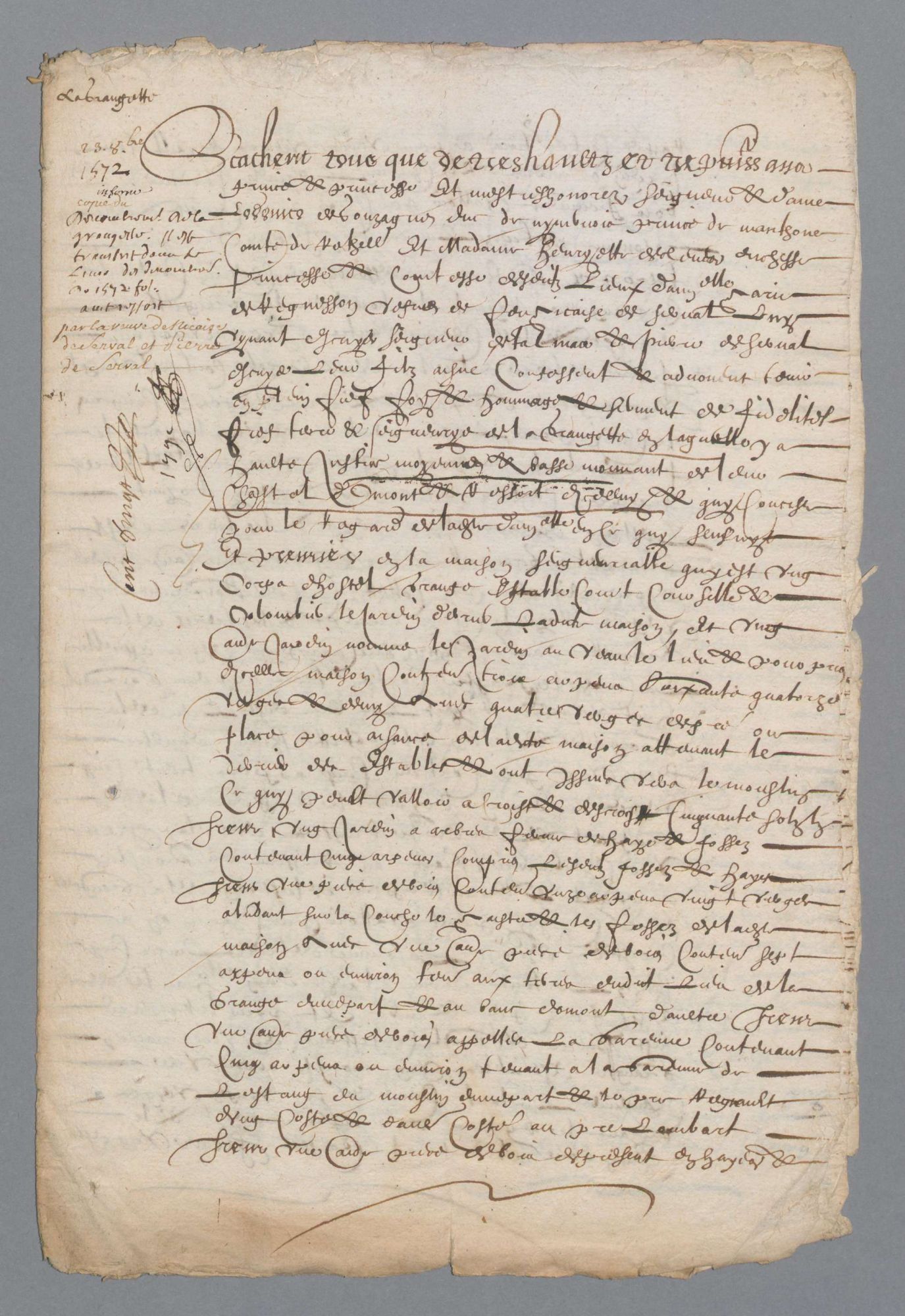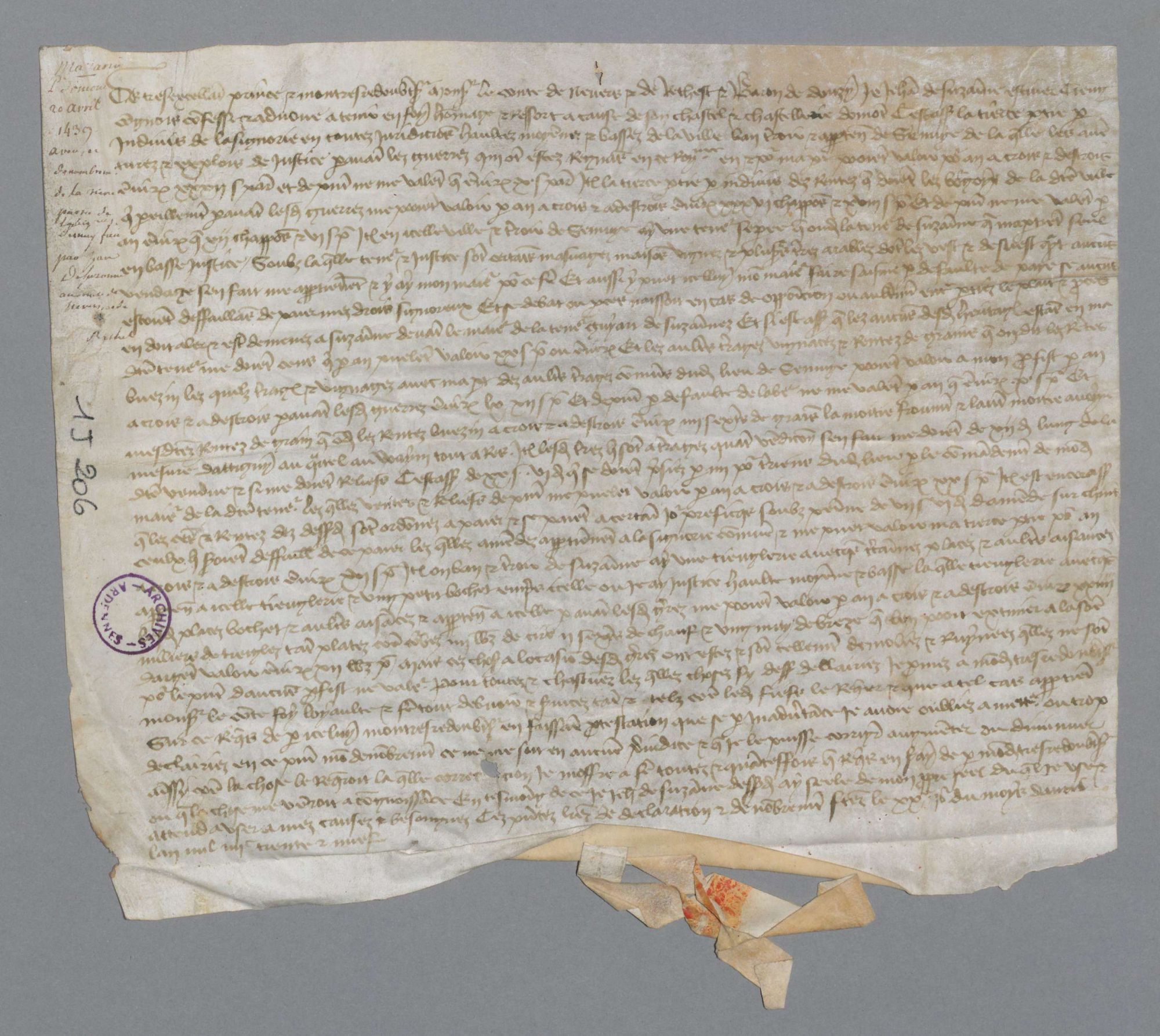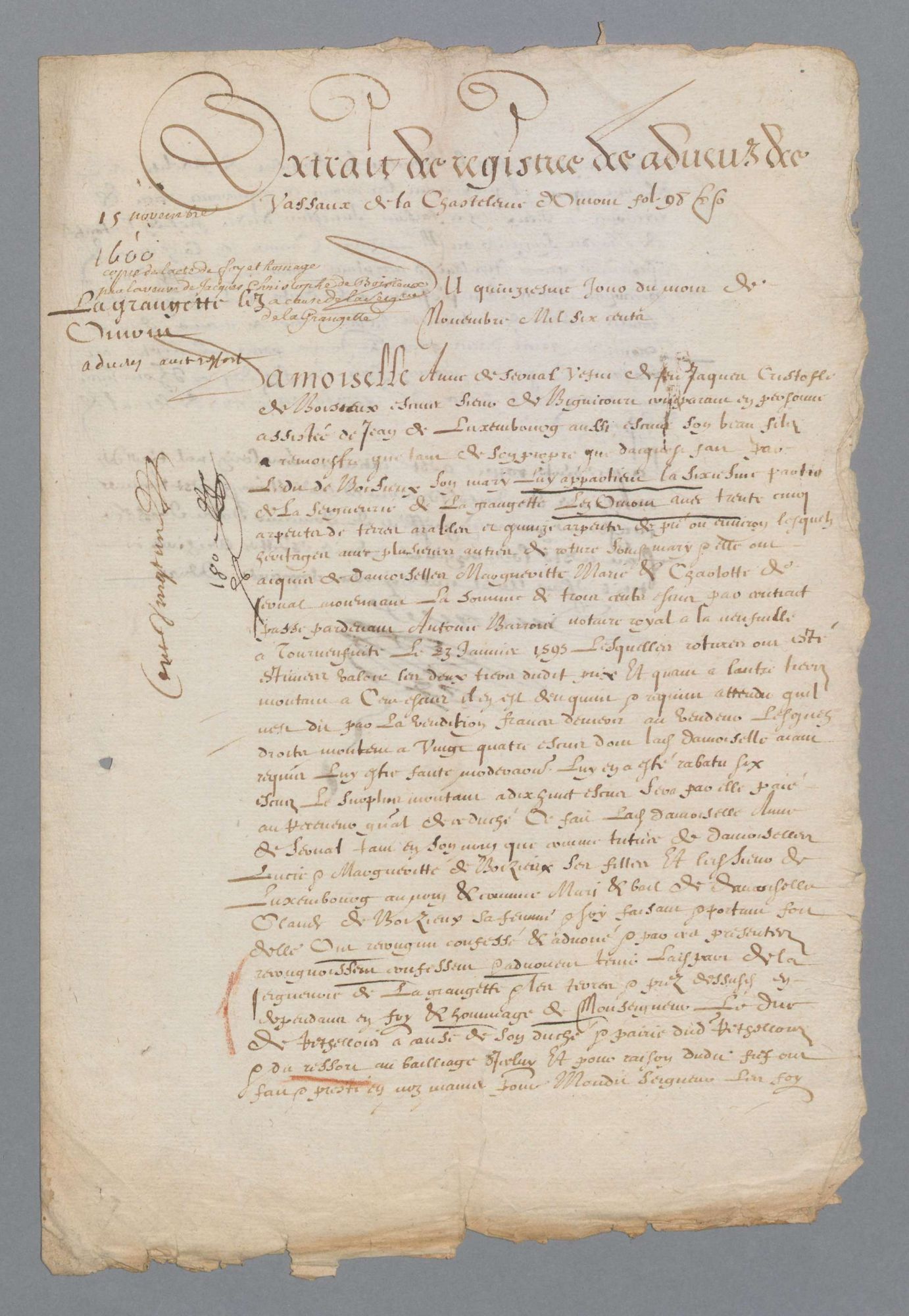 L’exemple du 1 J 206/2 - Aveux et dénombrement de la Châtellenie d'Omont : de Jean de Suzanne au comte de Rethel pour la seigneurie de Semuy (1440, n. st) ; de Marie de Requesson, veuve de Nicaise de Serval, au comte de Rethel pour la seigneurie de la Grangette, en la châtellenie d'Omont (1572) ; d'Anne de Serval, veuve de Jacques-Christophe de Bosieux, au duc de Rethel pour la seigneurie de la Grangette (1600) ; de Claude Desguiot au duc de Rethel pour la seigneurie de Charbonne (1611) ; de Philippe de Roste au duc de Rethel pour une seigneurie à Ecordal (1619) ; d'Hector d'Elaire au duc de Rethel pour la seigneurie de la Morteau et celle d'Argy (1630) ; du seigneur de la Morteau au duc de Mazarin pour les seigneuries de la Morteau et d'Argy (1667) (7 pièces dont 5 parchemins).