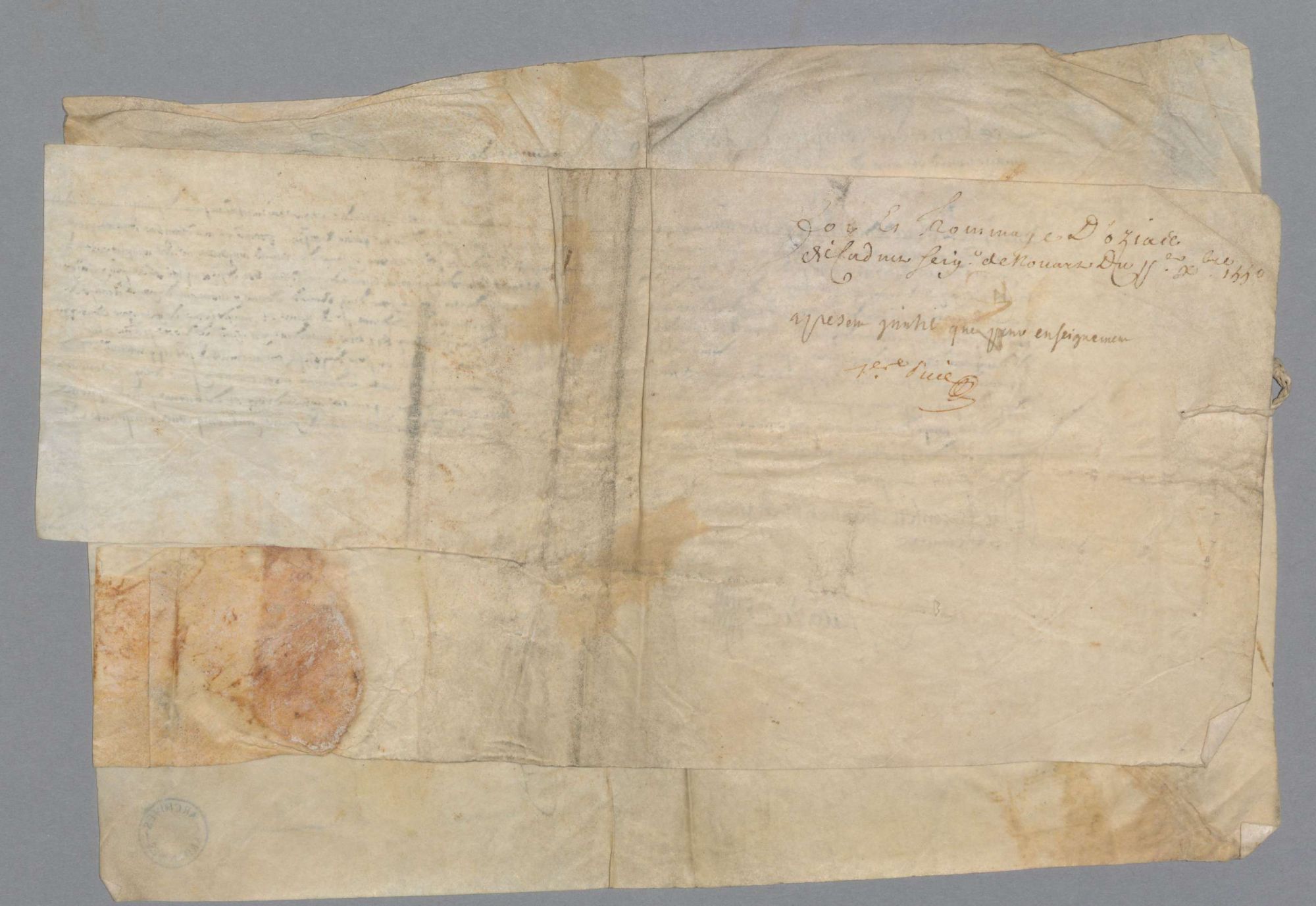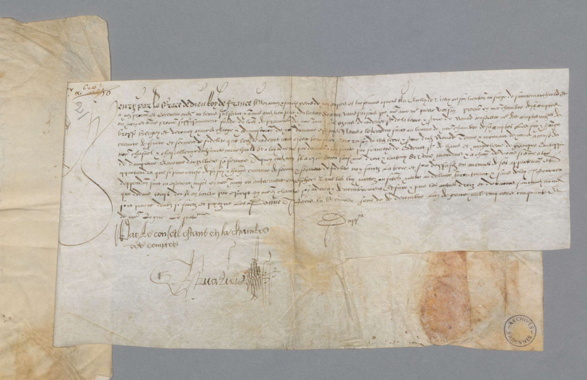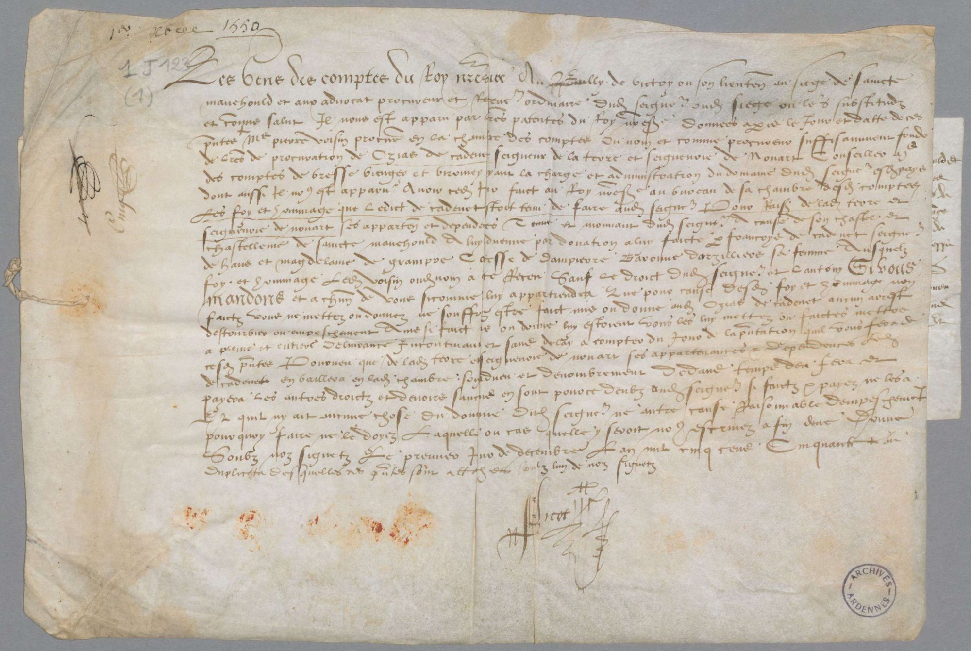 1 J 123/1. - Seigneurie de Nouart. Foi et hommage par Ozias de Cadenet, conseiller des comptes de Bresse, pour la terre de Nouart qui lui a été donnée par François de Cadenet, seigneur de Hans, et Madeleine de Grandpré, comtesse de Dampierre, sa femme (1er décembre 1550).