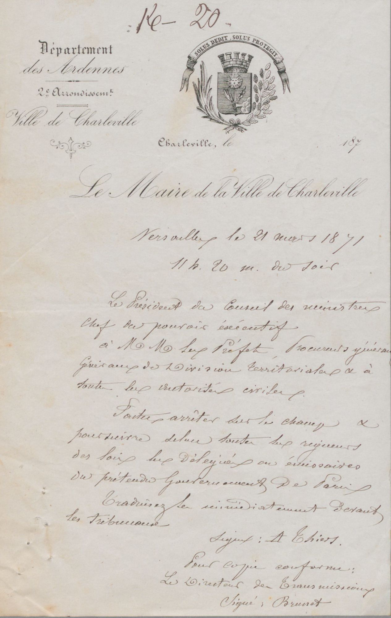Le maire de Charleville reçoit ainsi une dépêche télégraphique du 21 mars 1871 avec l’ordre suivant : « Faires arrêter sur le champ et poursuivre selon toutes les rigueurs des lois les délégués ou émissaires du prétendu gouvernement de Paris ». Le 22 mars, une nouvelle dépêche de Thiers cherche à dissuader tout responsable local de se rapprocher de la Commune en concluant « Il reste bien entendu que tout agent de l’autorité qui pactiserait avec le désordre sera poursuivi selon les lois comme coupable de forfaiture ».