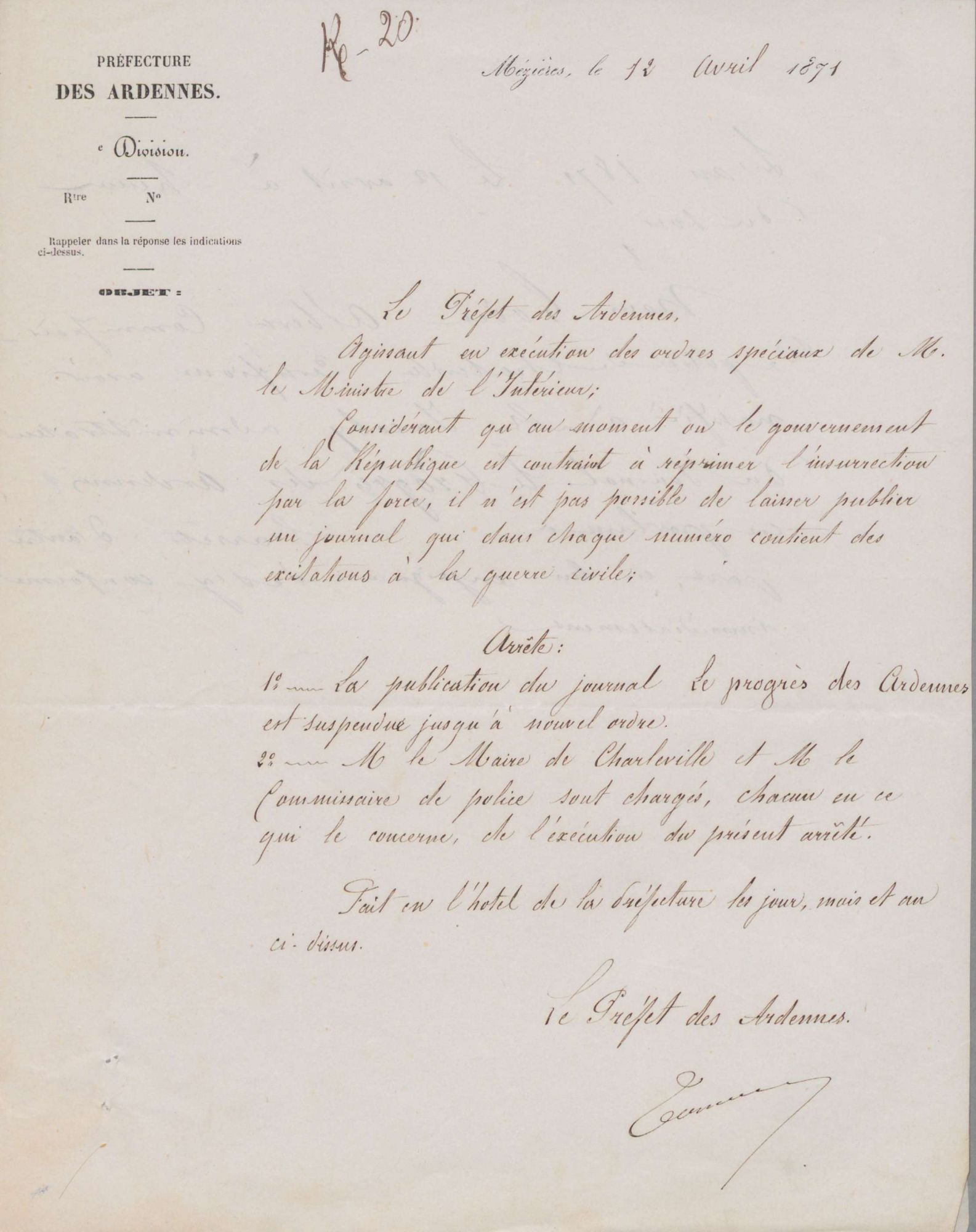 « Le préfet des Ardennes agissant en exécution des ordres spéciaux de M. le Ministre de l’Intérieur considérant qu’au moment où le gouvernement de la République est contraint à réprimer l’insurrection par la force il n’est pas possible de laisser publier un journal qui dans chaque numéro contient des excitations à la guerre civile, arrête : 1° la publication du journal Le progrès des Ardennes est suspendue jusqu’à nouvelle ordre. 2° M. le maire de Charleville et M. le commissaire de police sont chargés … de l’exécution du présent arrêté ».