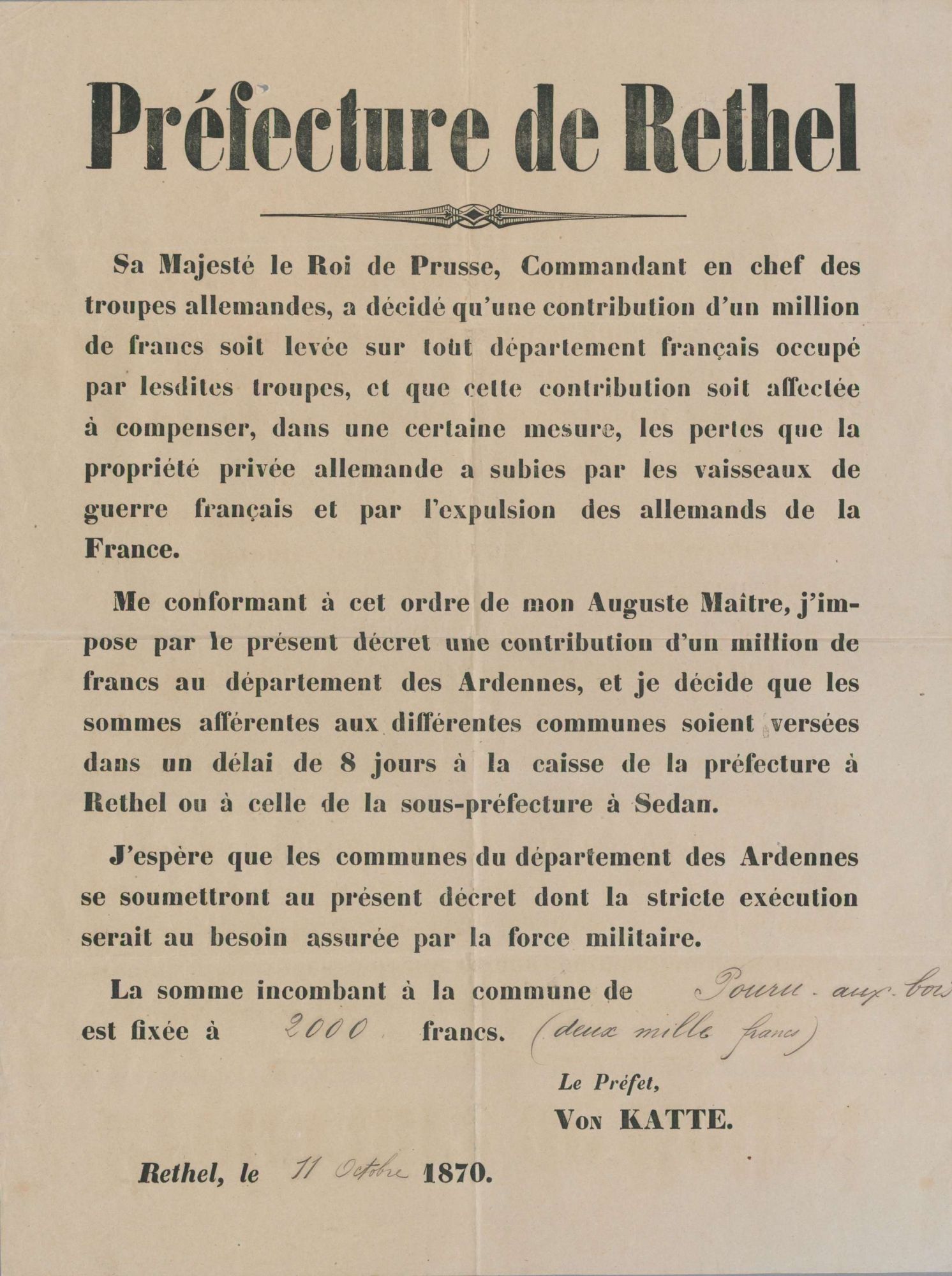 Les Allemands réclament également aux communes des contributions de guerre. Le 11 octobre 1870, par exemple; le préfet allemand de Rethel informe le maire de Pouru-aux-Bois que le « roi de Prusse, commandant en chef des troupes allemandes, a décidé qu’une contribution d’un million de francs soit levée sur tout département français occupé… et que cette contribution soit affectée à compenser les pertes que la propriété privée allemande a subies par les vaisseaux de guerre français et par l’expulsion des allemands de la France » et que la somme incombant à sa commune est fixée à 2 000 francs. Les autorités d’occupation exigent aussi la perception des impôts.