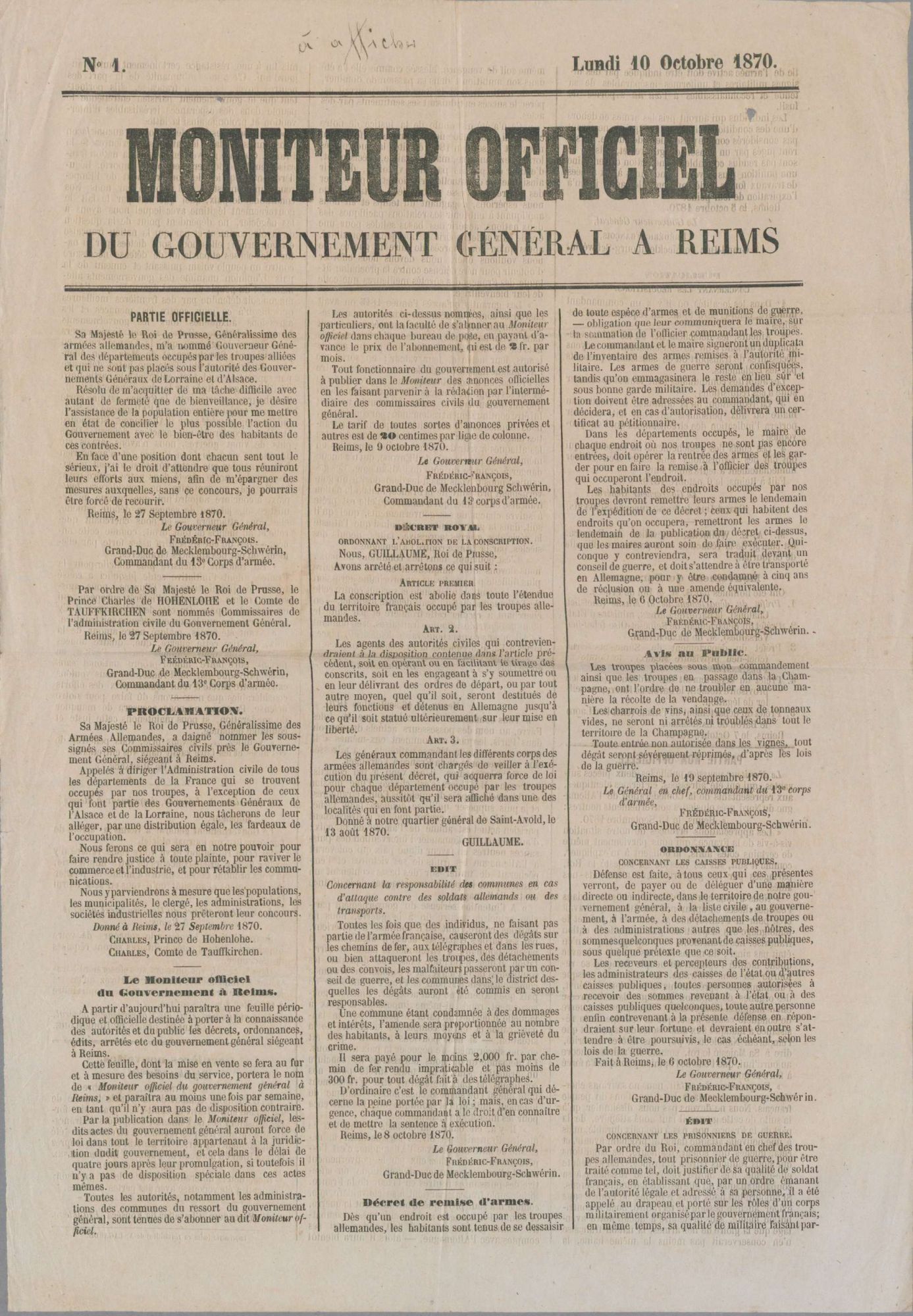 Le gouverneur général dispose pour faire connaitre ses ordres à la population occupée d’un journal officiel « Le Moniteur » dont le premier numéro paraît le 10 octobre 1870. La diffusion de ce journal est assurée par l’obligation pour les communes de s’y abonner. Dans ce journal sont également présentes des informations sur les opérations militaires qui continuent dans le reste du pays et des articles donnant le point de vue allemand sur la guerre. Il n’est cependant pas la seule source d’informations car l’armée allemande, hormis Paris qu’elle encercle efficacement, n’a pas les moyens d’occuper massivement le territoire ou de créer une ligne de démarcation étanche. Il est ainsi possible pour les voyageurs individuels aux prix de quelques précautions de se déplacer dans toute la France et de diffuser des informations. De plus, un journal comme Le Courrier des Ardennes après une interruption d’un mois reparaît à partir du mois de février 1871.