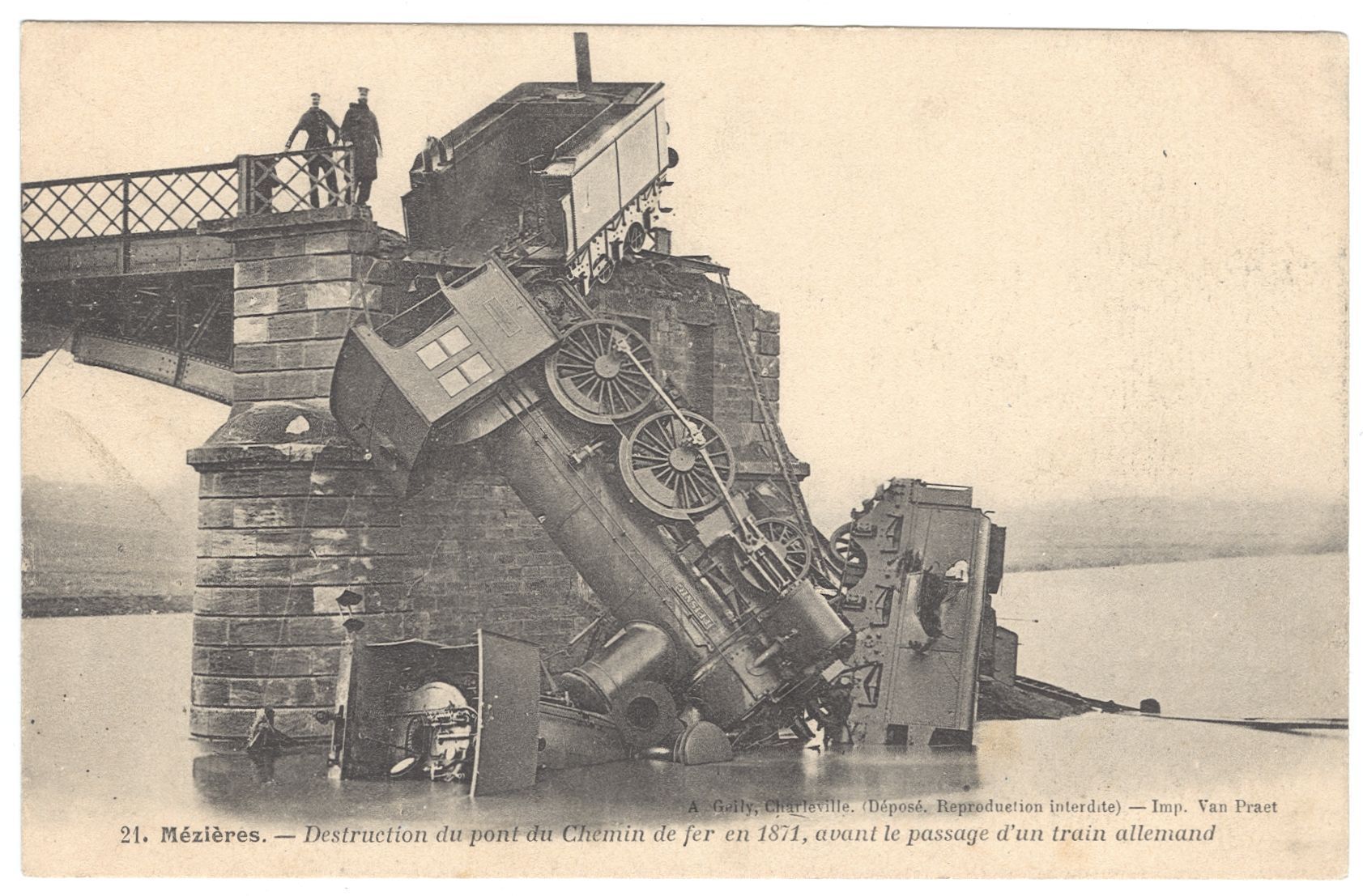 Les Allemands ont également la hantise des attaques contre les trains. Une carte postale conservée aux archives témoigne ainsi du déraillement d’un train à Mézières en 1871 suite à la destruction d’un pont de chemin de fer. Pour empêcher ces attaques, les Allemands instaurent la pratique de faire monter des notables dans les locomotives. Une délibération du conseil municipal de Sedan du 23 janvier 1871 retranscrit l’ordre de la commandantur suivant : « La mairie est priée de faire envoyer par l’autorité magistrale deux notables demain matin à 6 heures à la gare comme accompagnement d’un train. À dater d’aujourd’hui tous les trains partant devront être accompagnés par deux notables de la ville. ». De même, le 24 janvier 1871, la commandantur informe la mairie de Charleville qu’elle « vient d’être avisée de faire accompagner comme otages par des citoyens considérés tous les trains se dirigeant de Mohon sur Sedan et Rethel. La Mairie est priée de vouloir bien livrer à la commandantur la liste nominale des conseillers municipaux et de prévenir ces messieurs de se tenir prêt à accompagner les trains ».