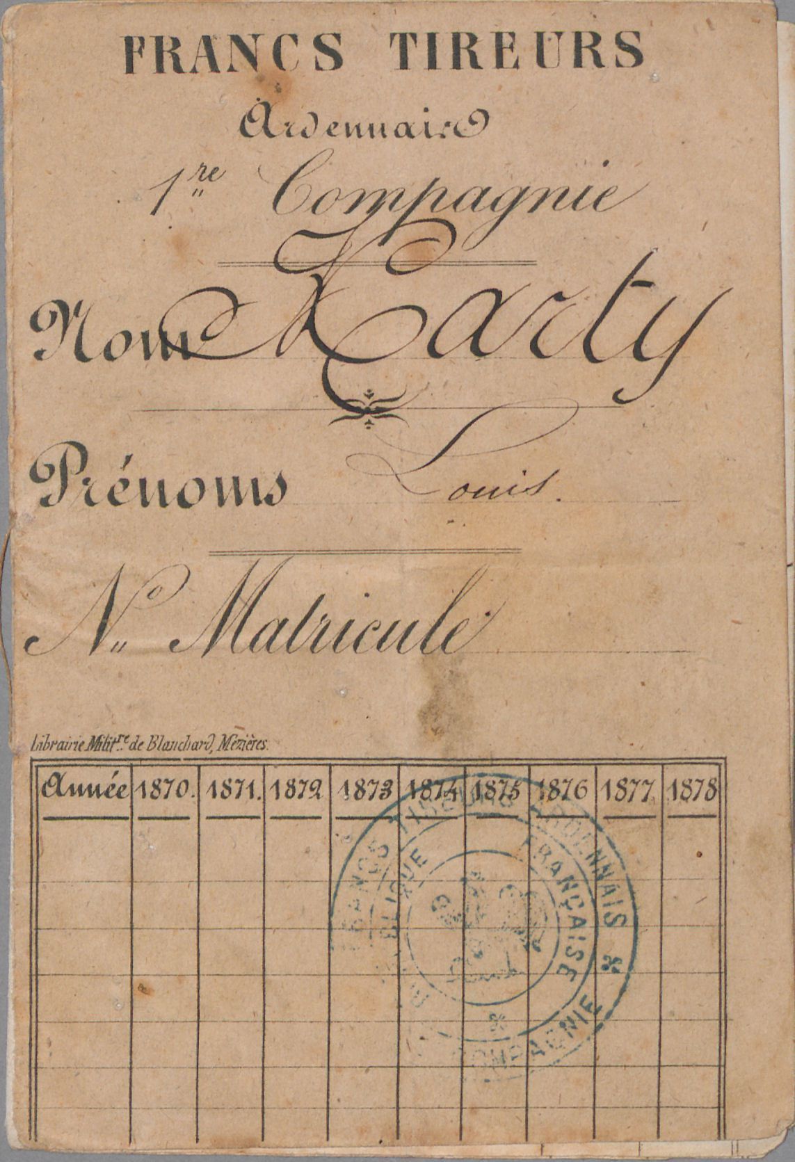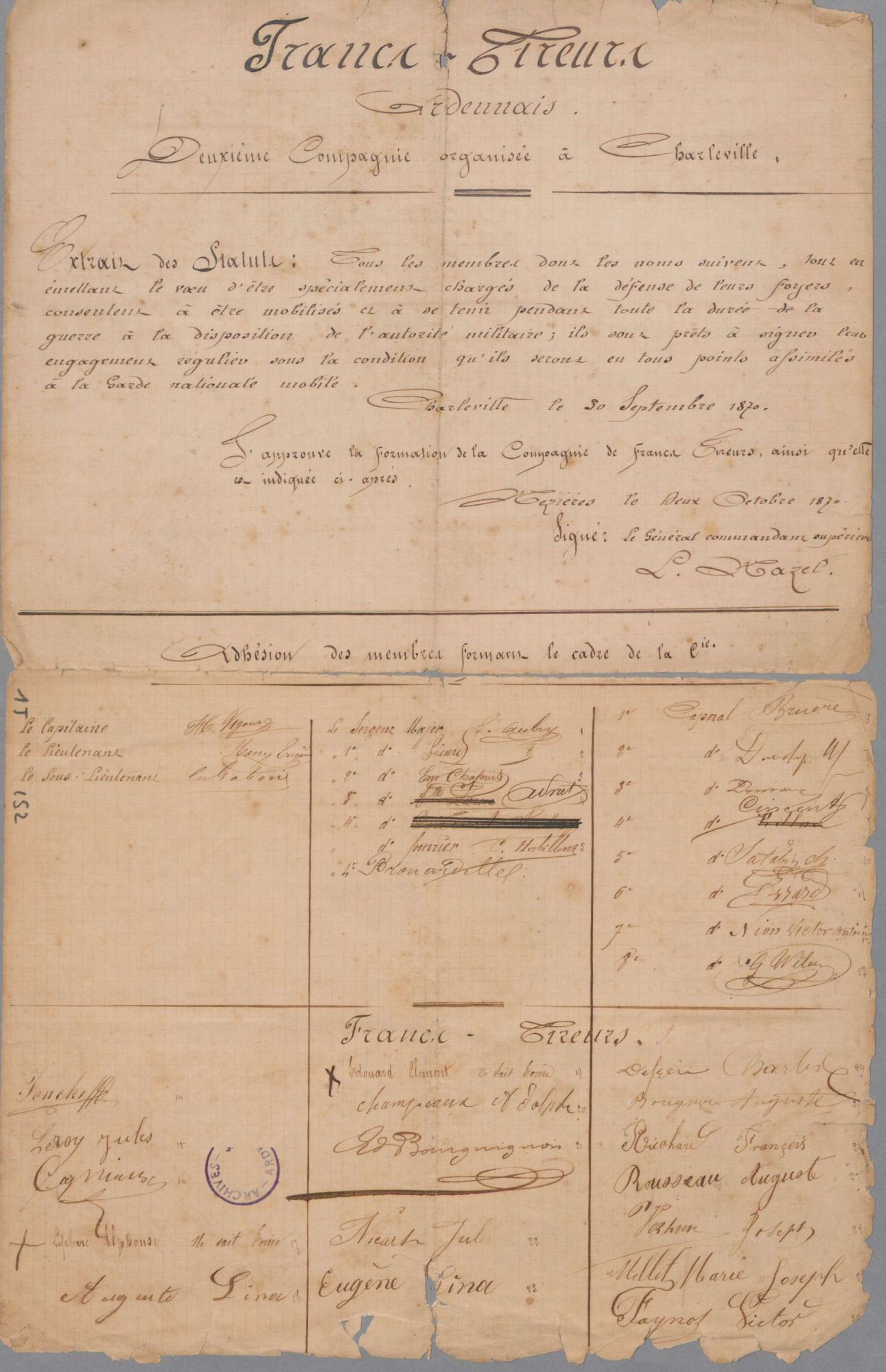 Les Archives départementales conservent notamment quelques documents relatifs aux francs-tireurs, c’est-à-dire des hommes qui prennent volontairement les armes et qui, selon la circulaire du ministère de l’Intérieur du 29 juillet 1870, sont chargés de la défense de leur foyer le temps de la guerre. Leur formation étant soumise aux autorités militaires locales, les compagnies de francs-tireurs doivent dresser des listes de leurs membres. C’est le cas de la deuxième compagnie organisée à Charleville de francs-tireurs ardennais qui soumet sa liste, conservée sous la cote 1J 152, le 30 septembre 1870, au commandant supérieur de la place de Mézières. Cette liste permet de découvrir les noms et grades de plus cent vingt francs-tireurs.