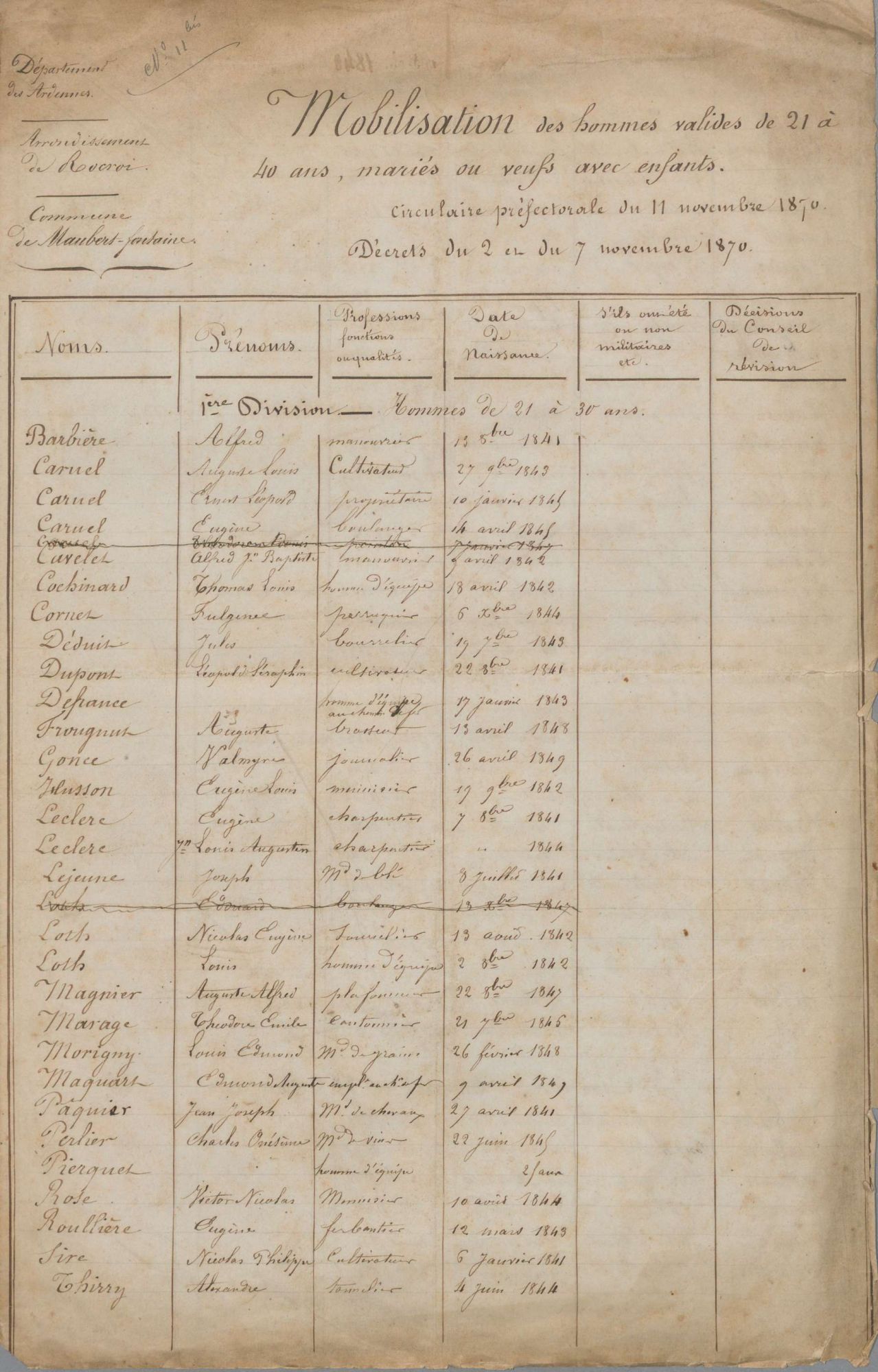 Cet ordre se traduit par la réalisation de listes d’hommes mobilisés dont on trouve trace notamment dans le fonds d’archives communales de Maubert-Fontaine. Datée du 18 novembre 1870, cette liste recense les noms de plus de quatre-vingt mobilisés. La présence d’une telle liste dans les archives d’une commune du nord-ouest du département n’est pas un hasard. En effet, elle fait partie de la zone du département encore sous contrôle français alors que le reste des Ardennes est occupé par les troupes allemandes.