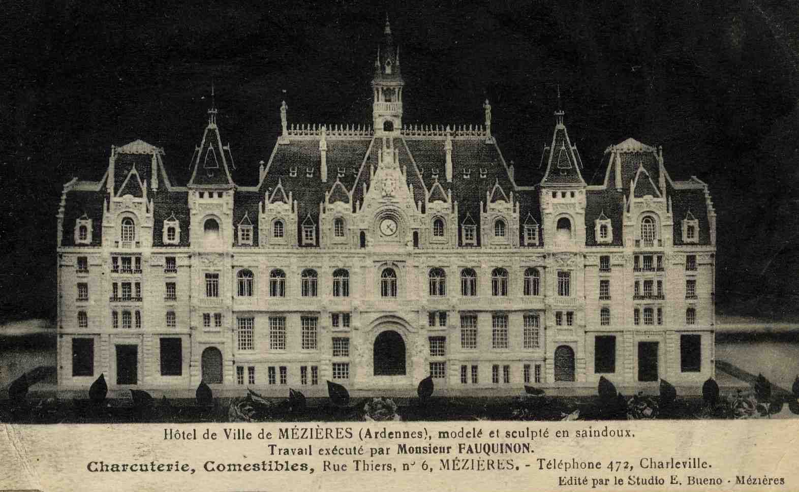 Cette carte postale n’est pas la énième carte postale de l’hôtel de ville de Mézières, mais une véritable œuvre d’art. Il s’agit en effet d’une sculpture réalisée en saindoux par un charcutier nommé Charles Fauquinon, dont le commerce se situait rue Thiers à Mézières (actuellement rue des comtes de Rethel). Quelle surprenante idée n’est-ce pas ? Mais notez la finesse de cette œuvre.