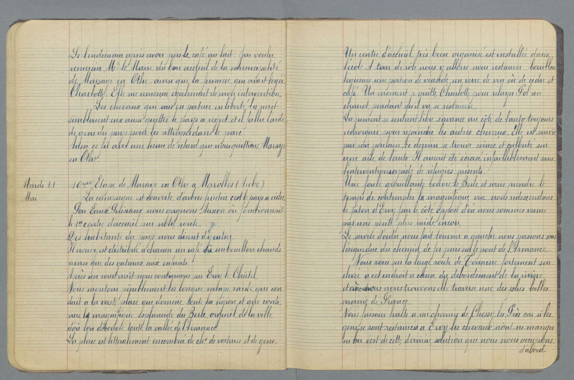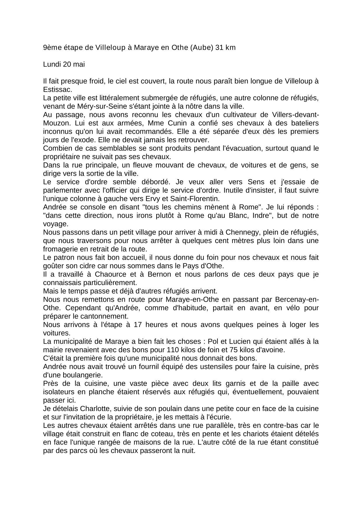 Cela fait huit jours que Jules Fortier a quitté ses Ardennes natales. En cette neuvième étape de son exode, il se trouve dans l’Aube, entre Villeloup et Maraye-en-Othe, à l’ouest de Troyes. Son itinéraire lui a fait parcourir plus de 230 km, toujours en charrette, toujours sur les routes avec de nombreux réfugiés, toujours dans l’incertitude. Il nous raconte sa journée…