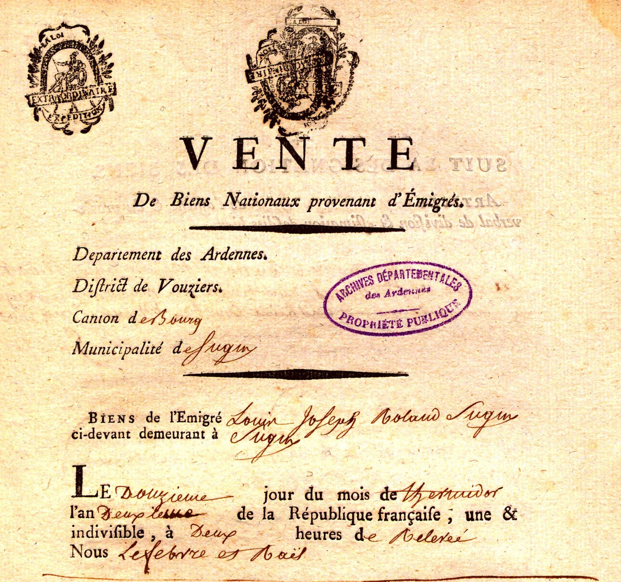 Ce fonds est entré aux Archives départementales des Ardennes au début du XXe siècle et a fait l’objet d’un répertoire imprimé en 1911. Hélas, à peine un tiers du fonds a échappé aux dommages de mai 1940. Un instrument de recherche a aujourd’hui été rédigé permettant l’interrogation du fonds sur la base de données du portail des Archives départementales : un outil indispensable pour retrouver facilement les documents intéressant la vente des Biens nationaux, un des évènements les plus importants de la Révolution française.