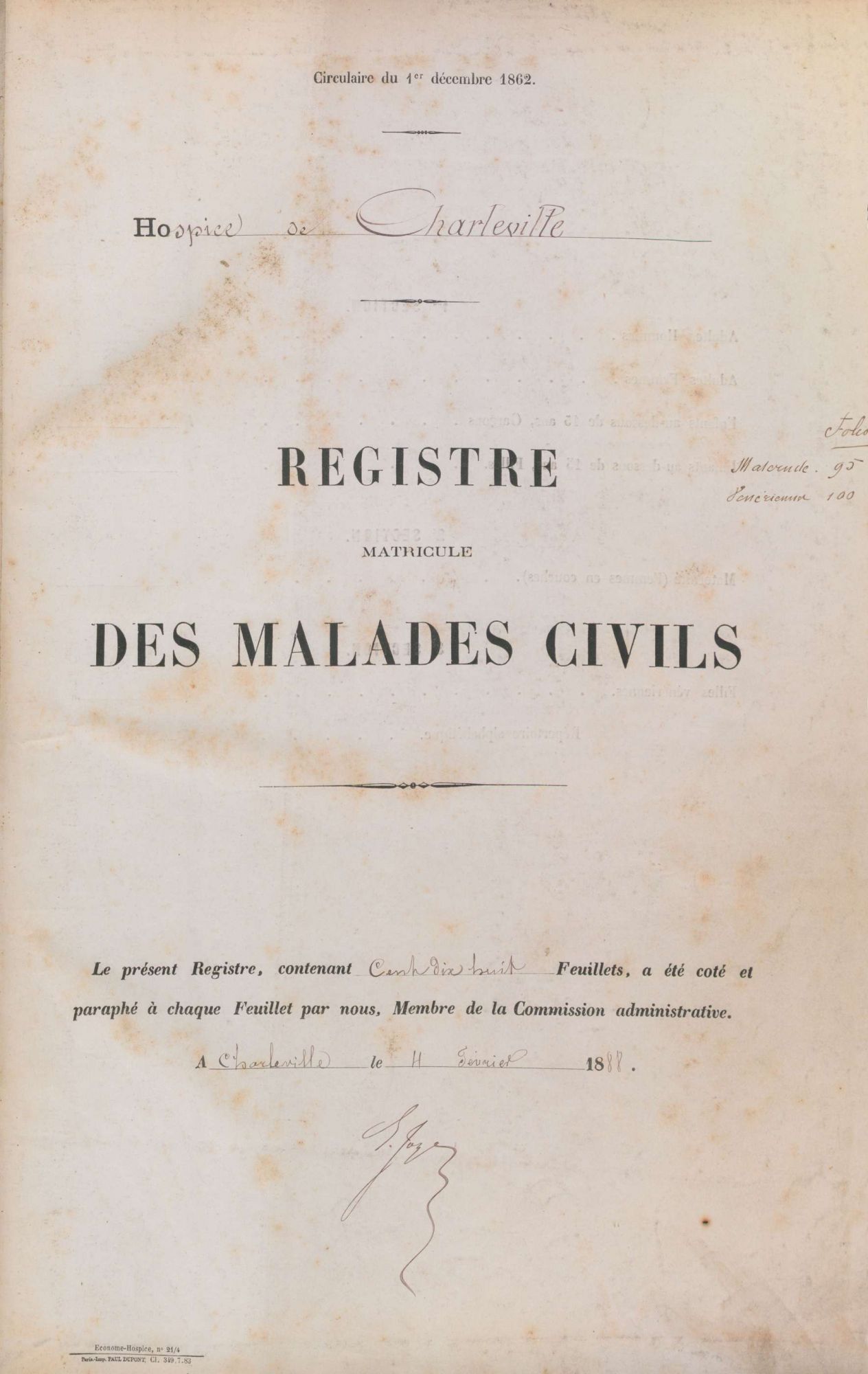 On peut applaudir l’archiviste du centre hospitalier de Charleville-Mézières. Elle a rassemblé patiemment les anciens registres de ces hôpitaux, les a classés, inventoriés et versés aux Archives départementales. Ce fonds est d’une très grande richesse : registres d’entrées et sorties des malades civils, des orphelins, des enfants assistés depuis 1887, etc...