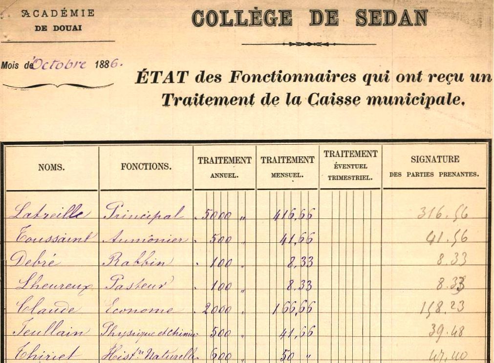 Il s’agit d’un ensemble de registres de traitement du personnel du collège Turenne de Sedan entre 1886 et 1938 dans lesquels figurent les listes nominatives des fonctionnaires (principaux, surveillants généraux, aumôniers, professeurs par niveau et matière) et leurs traitements mensuels. On peut remarquer la présence du rabbin Debré, père de Robert Debré né à Sedan. Ces documents ont intégré la série T, consacrée à l’enseignement, et portent la cote 1T 573.
