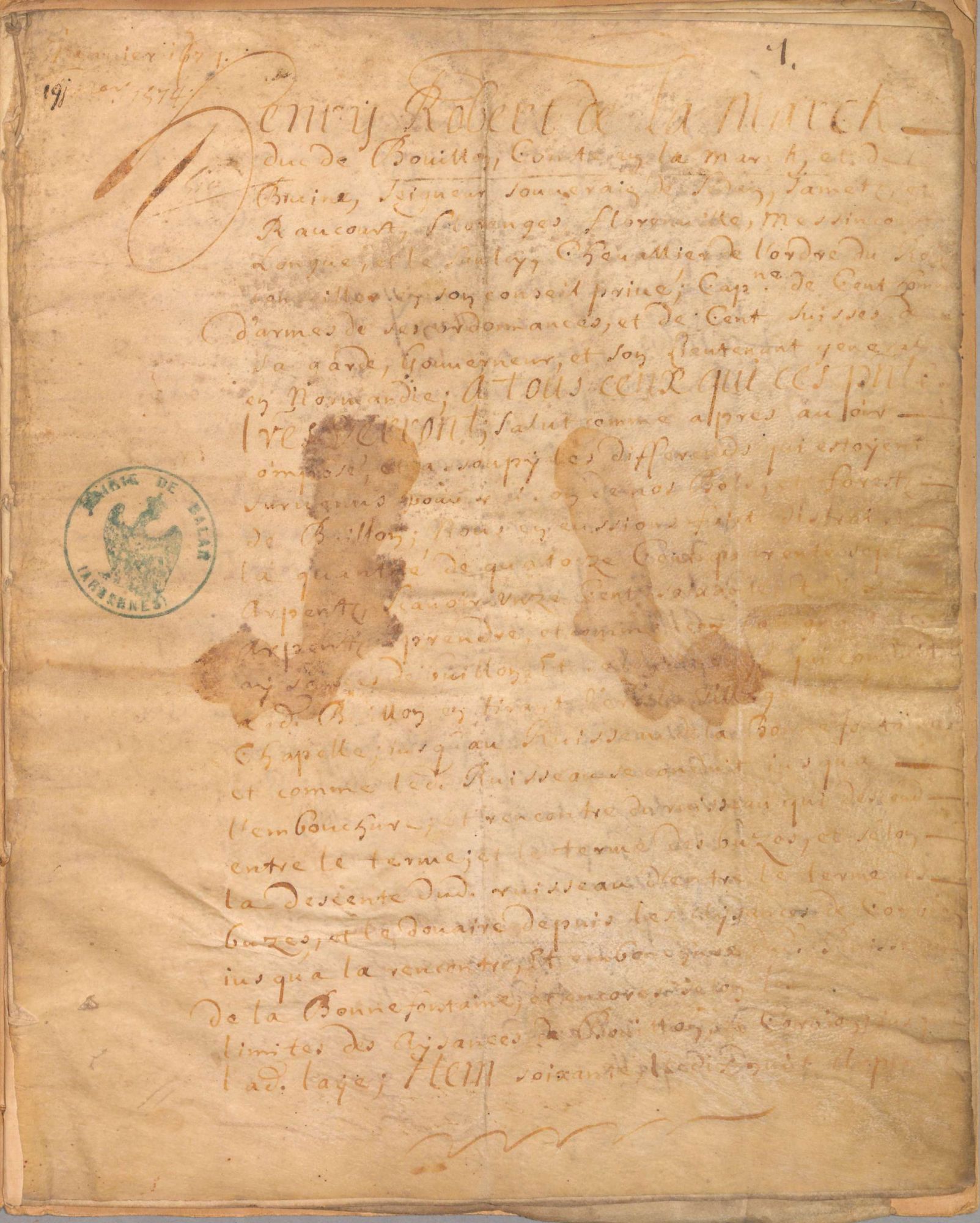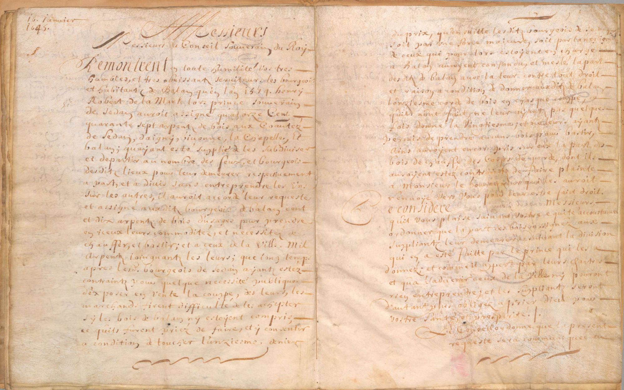 Le fonds des archives communales de Balan, déposé aux Archives départementales depuis 1973, a retrouvé deux documents anciens : le premier est une transcription de 1672 de la charte octroyée par Henri Robert de La Marck, Prince de Sedan, en janvier 1574 aux villages de Balan, Sedan, Dagny, Givonne et La Chapelle pour leur donner des espaces boisés et des droits d’usage afférant. Cette charte a été fondatrice puisqu’elle a donné le support juridique de ces communautés villageoises pour défendre, aux siècles suivants, leur droit à user du bois issu de ces forêts. C’est pourquoi, au XVIIe siècle, des procédures ont été engagées par les bourgeois et les habitants pour conserver leurs privilèges et ont conduit à retranscrire intégralement le texte de la charte dont l’original n’est pas conservé.
