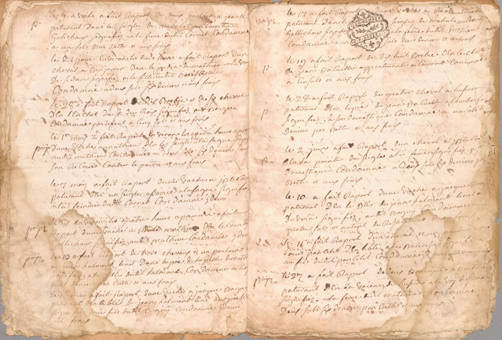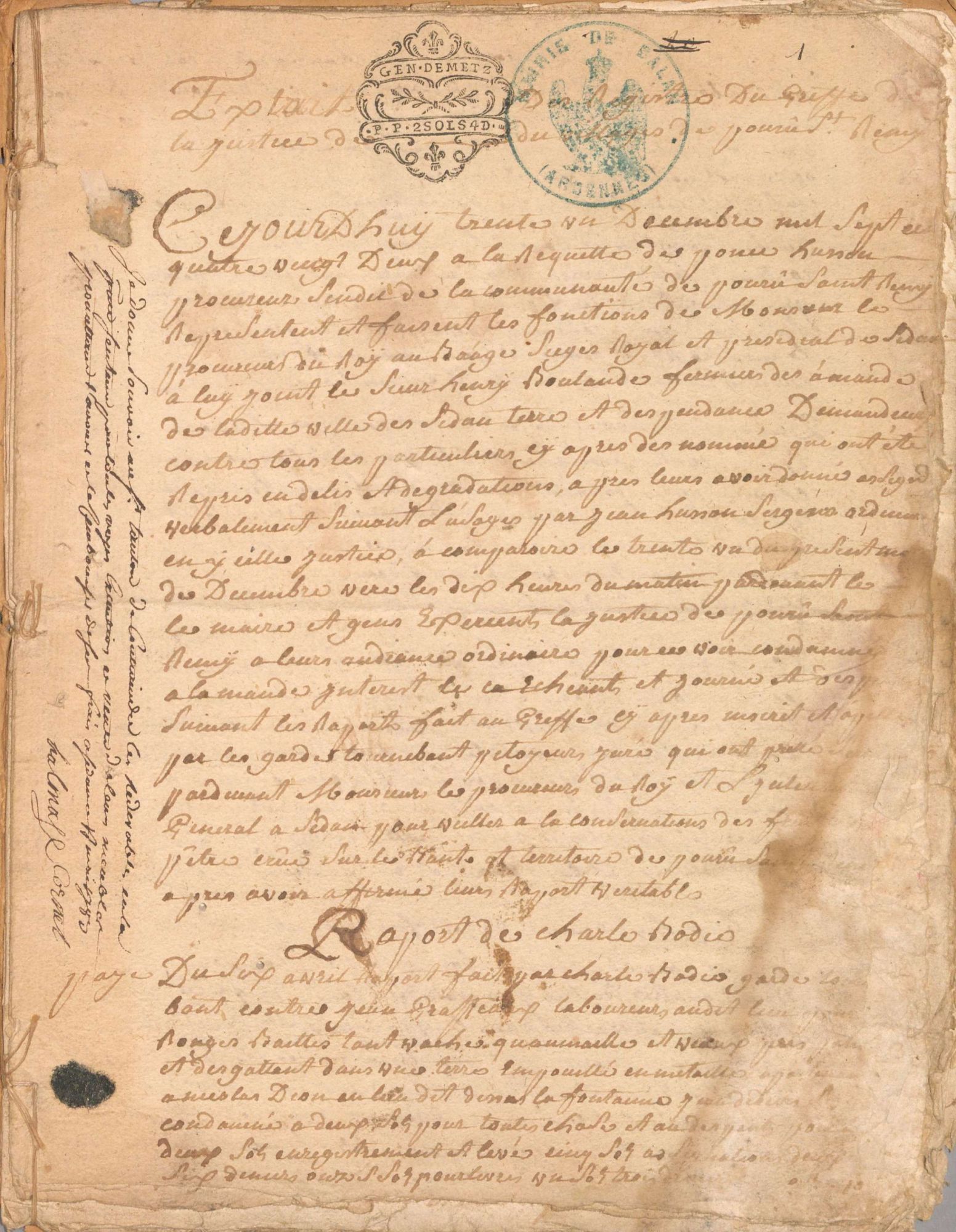 Le second est constitué d’extraits de registres de greffes de la justice de Pouru-Saint-Rémy, de Fleigneux et de Douzy, datés de 1782 et 1783. Ces extraits évoquent des affaires de justice quotidienne entre les habitants de ces villages au sujet de leurs droits ou de leurs contentieux.