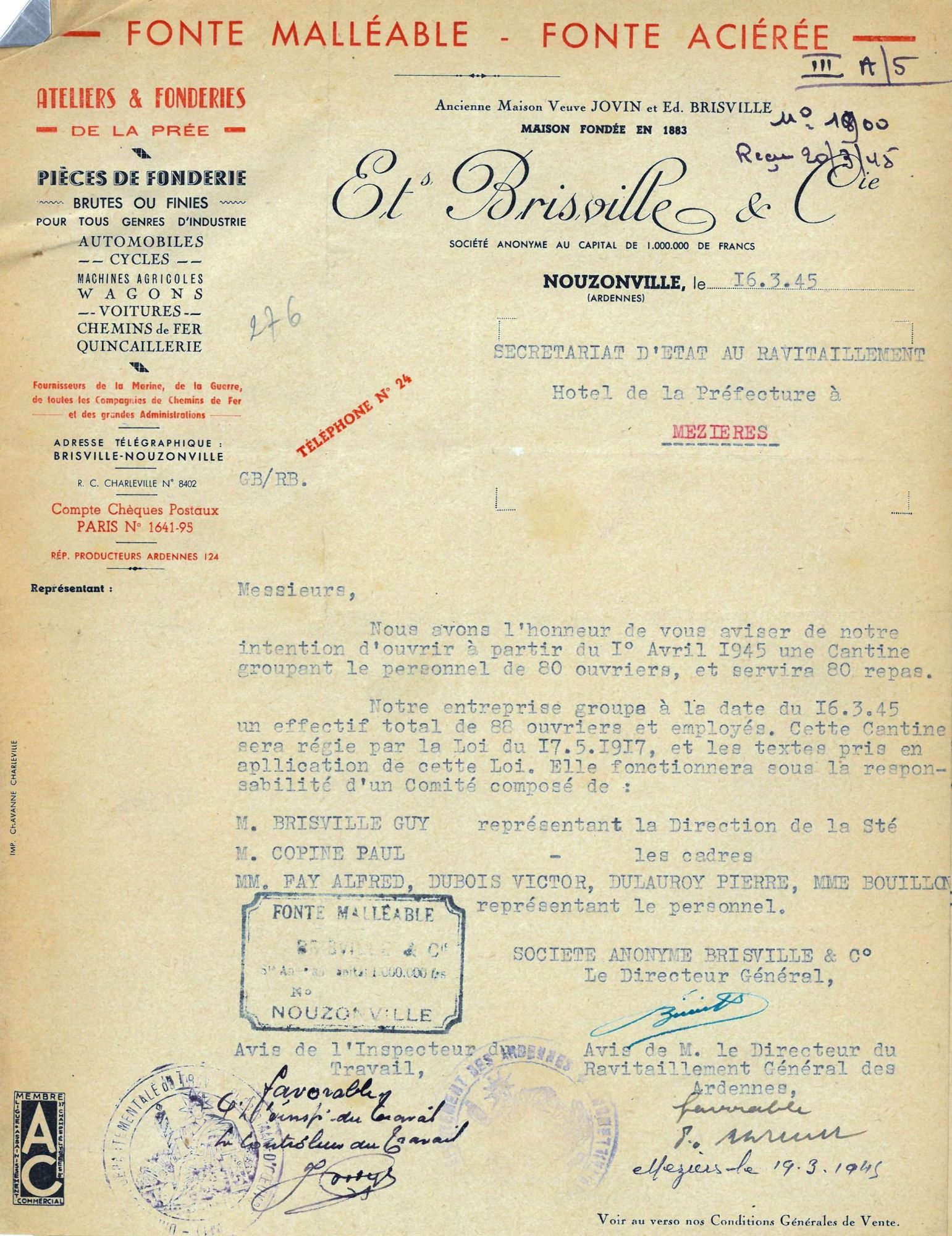 C’est un petit fonds par sa taille qui a été découvert il y a peu, petit mais loin d’être inintéressant ! Versé en décembre 1948 par la préfecture, il s’agit d’un ensemble de 600 demandes d’autorisation d’ouverture de cantines au sein des usines, administrations et établissements publics et privés ardennais entre 1943 et 1947. Depuis son versement, ces deux boîtes d’archives étaient restées isolées ; elles ont été aujourd’hui classées, cotées et identifiées par un instrument de recherche.