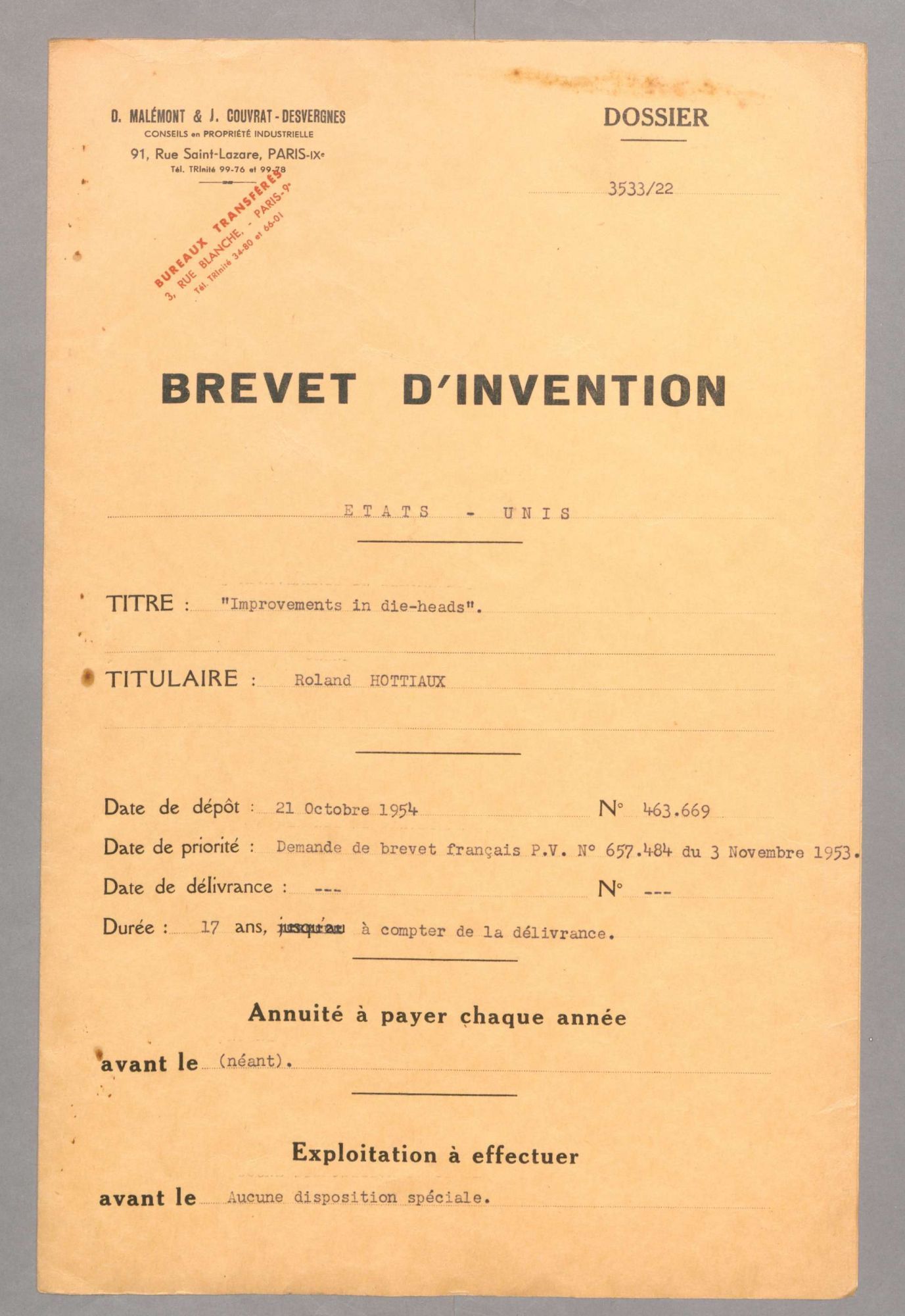 Des années 1950 aux années 1970, les Établissements Hottiaux connaissent une période de pleine prospérité, de nombreuses entreprises françaises et étrangères achètent ses machines et ses pièces de machines perçues comme des produits de grandes qualités. Sa renommée lui permet d’obtenir de nombreux brevets, tant en France qu'à l'étranger (Etats-Unis, Allemagne, Angleterre, ltalie, Belgique, Suisse) (58 J 43-50). Ils concluent alors des partenariats avec d’autres entreprises reconnues, comme Nouméca (58 J 81).