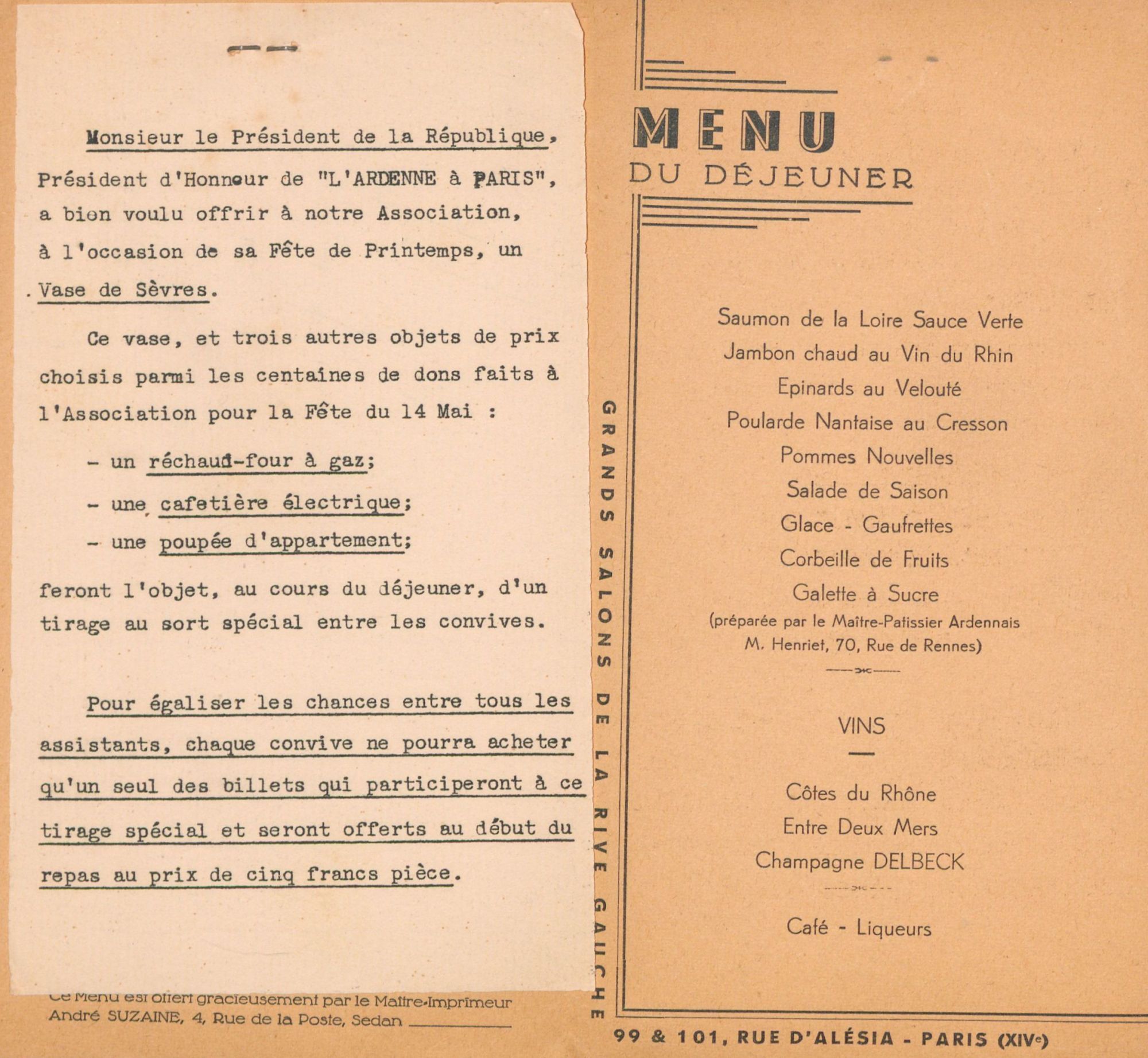 Autrefois, L’Ardenne à Paris organisait chaque année une Fête de printemps. Il s’agissait d’un repas convivial au cours duquel une tombola était organisée. Cette cérémonie a pris fin en 2001 date à laquelle elle a été abandonnée par le Comité directeur en raison du manque de participation avec l’approbation de la majorité des adhérents. En 1933, une personnalité importante de la vie politique française avait offert à l’association une magnifique bonbonnière en porcelaine de Sèvres pour sa tombola annuelle. Cette personnalité n’est autre qu’Albert Lebrun, Président de la République de 1932 à 1940. Ce dernier était Lorrain, mais son épouse, Jeanne Nivoit était Ardennaise, et, même si elle n’a probablement pas adhéré à L’Ardenne à Paris, elle en était proche et l’avait promue auprès de son époux. Dans tous les cas, le cadeau du président Albert Lebrun témoigne de la renommée qu’avait L’Ardenne à Paris à cette époque. En 1954, l’association reprit ses activités après treize ans de mise sommeil en raison de la Seconde Guerre mondiale. Le Comité directeur décide de remettre en place dès cette année-là la Fête annuelle de printemps. Se souvenant du geste d’Albert Lebrun, Paul Leclers écrivit une lettre au président de la République René Coty pour lui demander de le renouveler. Ce dernier répondit de manière favorable à cette requête. Ce renouvellement du cadeau permit à une véritable tradition de se mettre en place : chaque année, le Président de L’Ardenne à Paris écrivait une lettre au Président de la République pour lui demander d’offrir à l’association un vase en porcelaine de Sèvres pour sa tombola annuelle et cette demande était toujours acceptée par l’Élysée.