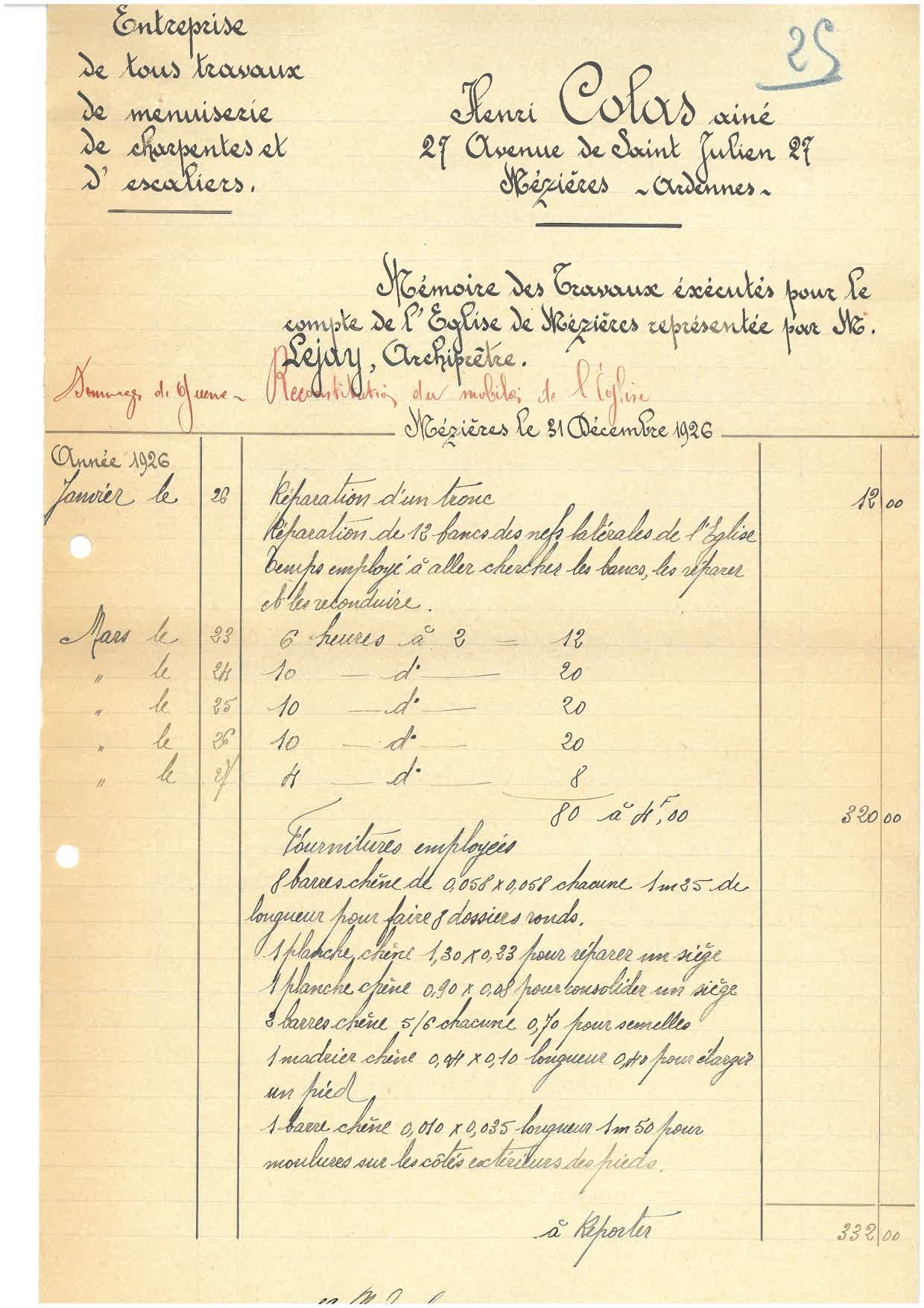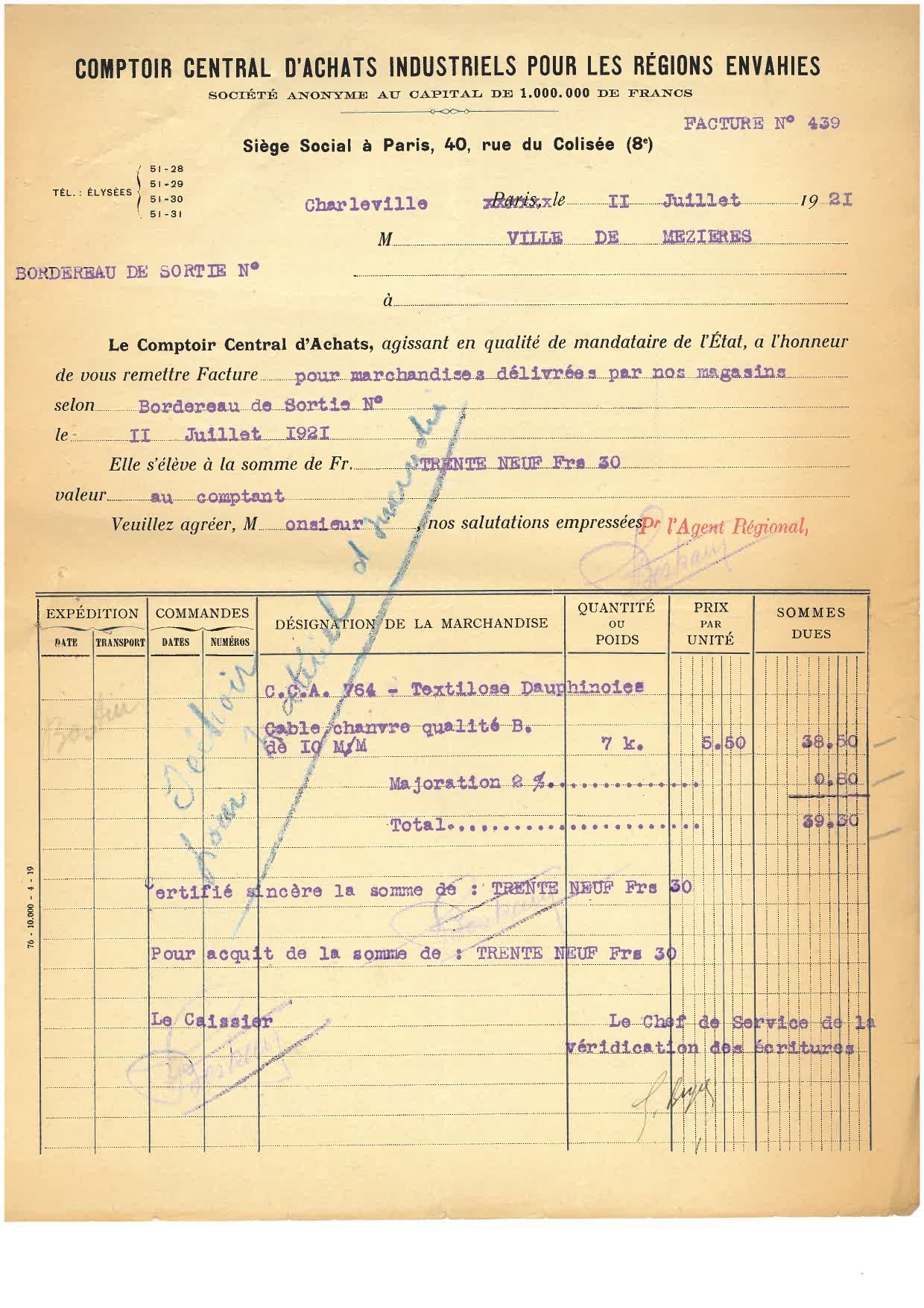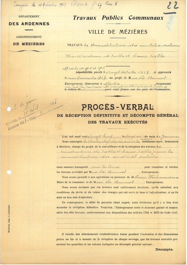 À l’occasion du reclassement d’anciens fonds, occasion a été donnée de réintégrer une quinzaine de liasses relatives aux dommages de guerre subis par la ville de Mézières lors de la Première Guerre mondiale.