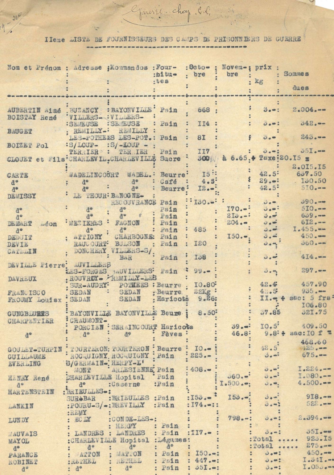 Le fonds, émanant du service des prisonniers de guerre de la préfecture des Ardennes, est constitué essentiellement de pièces comptables relatives aux fournitures apportées aux différents camps de prisonniers des Ardennes entre 1941 et 1944. Outre des bons d'approvisionnement et des listes nominatives des fournisseurs, le fonds se compose de nombreuses factures avec papier à en-tête des commerçants qui demandent le paiement de leurs marchandises auprès de la préfecture. Ces documents donnent des indications précises sur les camps de prisonniers en eux-mêmes et sur la manière dont ils sont ravitaillés par les commerçants du département.