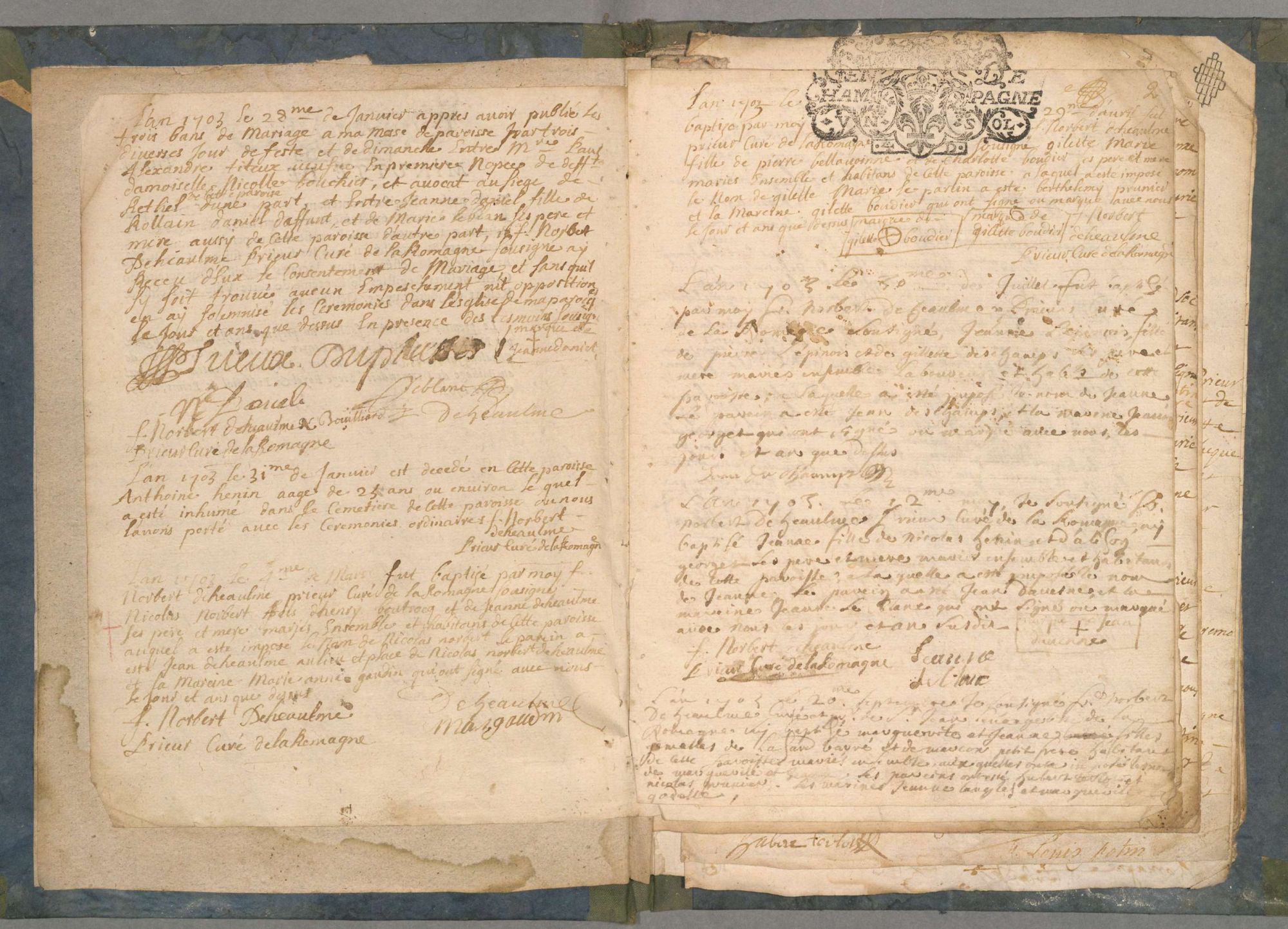 Les Archives départementales ont retrouvé, à la faveur d’une visite d’inspection, un registre d’actes paroissiaux de La Romagne pour les années comprises entre 1703 et 1712. Ce registre comble une lacune dans l’état civil de cette commune qui était jusqu’à présent en ligne. La collection est désormais complète depuis 1693. Il s’agit d’une redécouverte importante pour l’histoire généalogique des familles de La Romagne. Le registre a par conséquent été numérisé et les actes sont désormais accessibles à cette adresse :