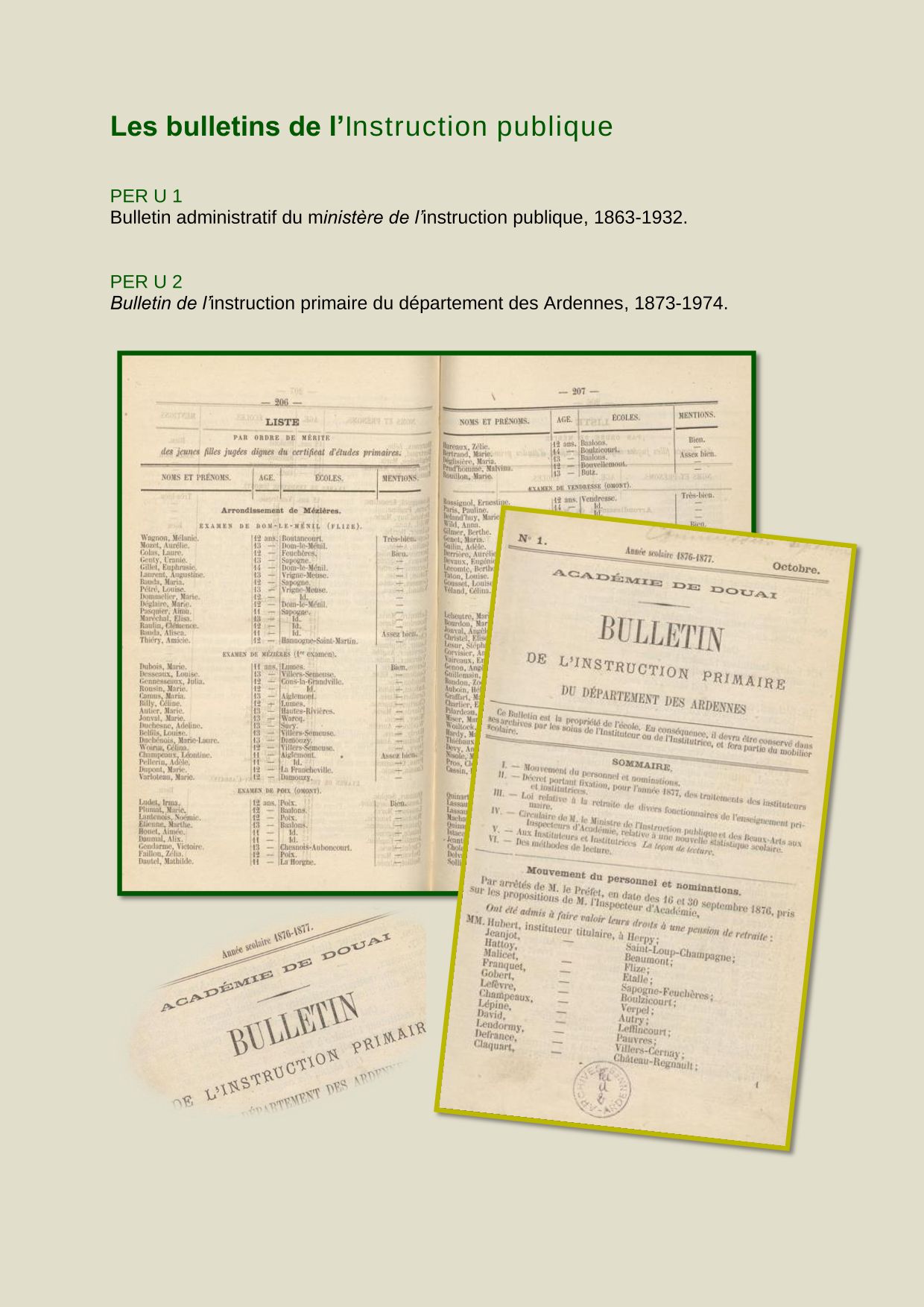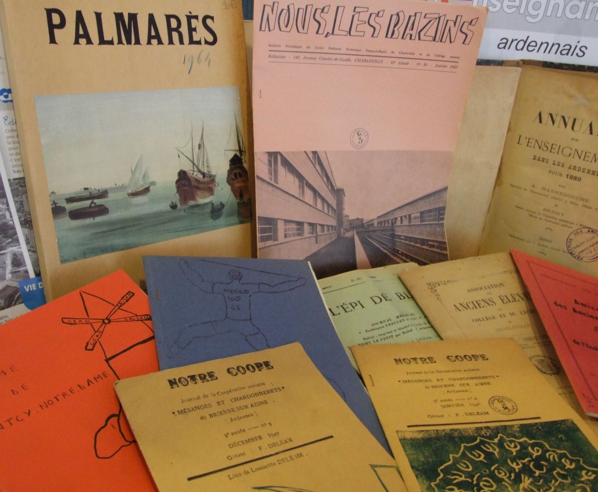 Parmi les trésors de la bibliothèque, nous conservons un ensemble de périodiques concernant l’enseignement primaire et secondaire dans le département des Ardennes. Ces bulletins viennent compléter les fonds d’archives émanant de la Direction des Services Départementaux de l’Éducation Nationale des Ardennes (DSDEN 08). Il s’agit de journaux scolaires publiés par les écoles du département, de bulletins édités par des syndicats d’enseignants ou par des associations d’anciens élèves. Enfin deux références incontournables pour les chercheurs : le « Bulletin de l’instruction primaire du département des Ardennes » et l’« Annuaire de l’enseignement dans les Ardennes » dans lesquels le chercheur pourra retrouver pour certaines années :