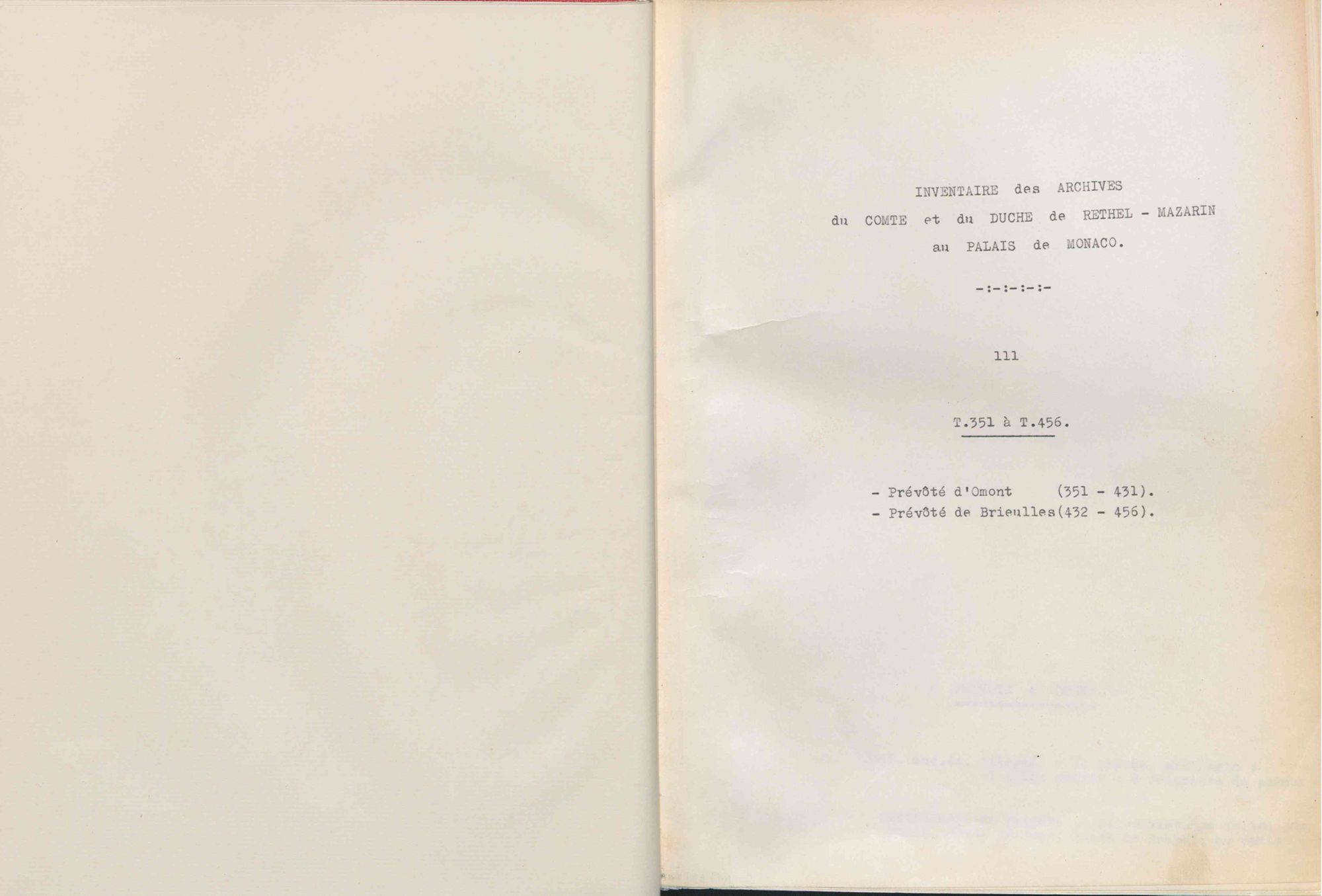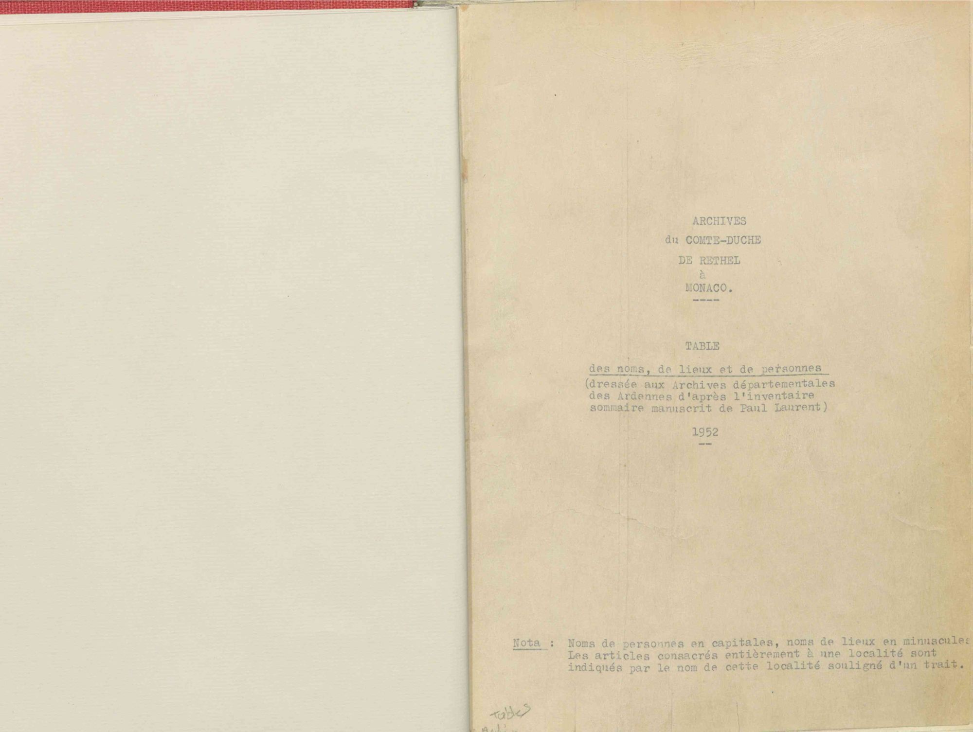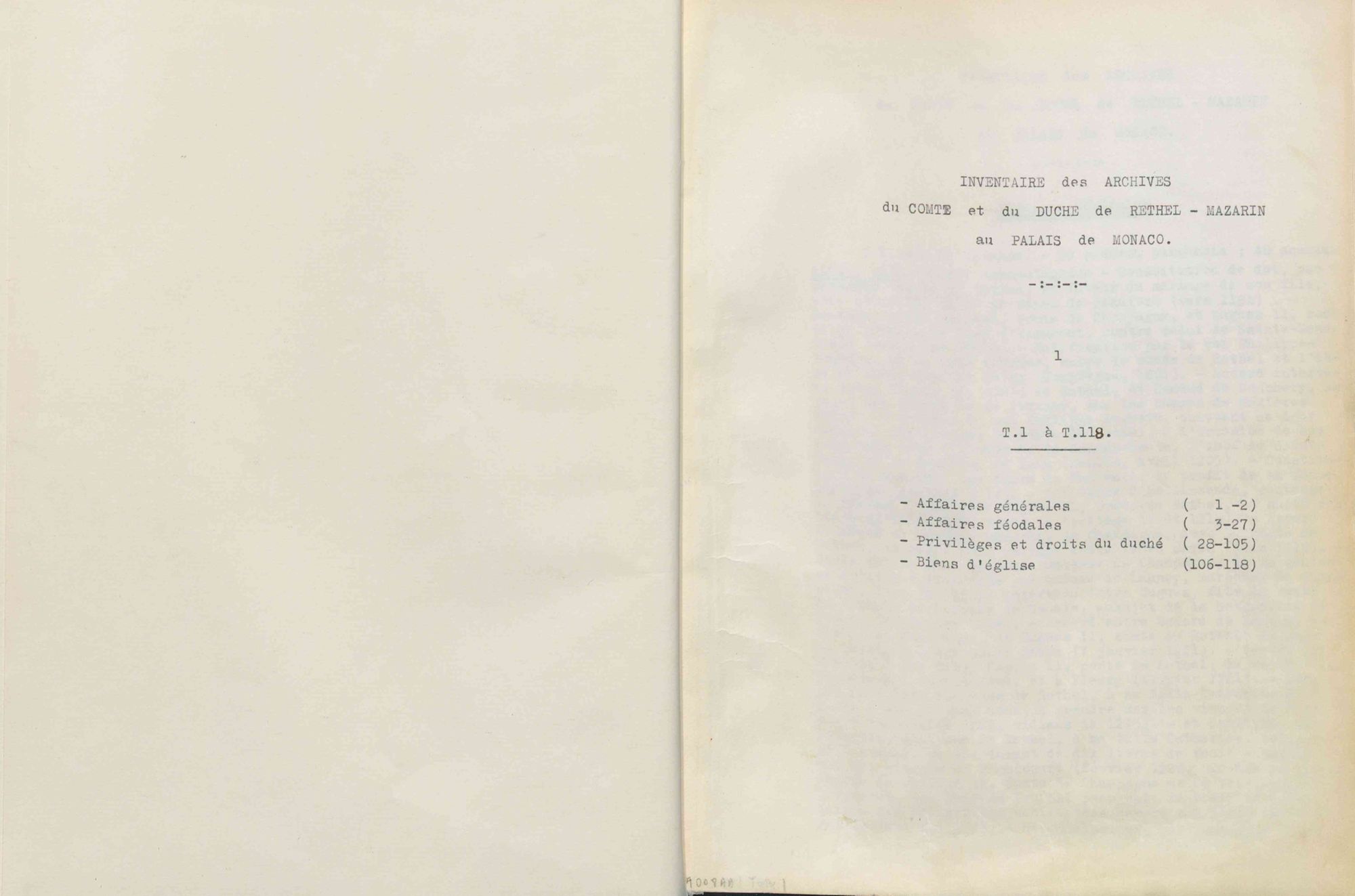 Archives relatives aux Ardennes non conservées aux Archives départementales des Ardennes Archives princières de Monaco Série T - Archives du comté et duché de Rethel-Mazarin. Tome I. Cotes T 1 à T 118 (97.3 Mo) Série T - Archives du comté et duché de Rethel-Mazarin. Tome II. Cotes T 119 à T 464 (91.6 Mo) Série T - Archives du comté et duché de Rethel-Mazarin. Tome III. Cotes T 351 à T 456 (68.3 Mo) Série T - Archives du comté et duché de Rethel-Mazarin. Tome IV (77.2 Mo) Série T - Archives du comté et duché de Rethel-Mazarin. Tome V. Cotes T 582 à T 738 (97.7 Mo) Série T - Archives du comté et duché de Rethel-Mazarin. Table (99.2 Mo)