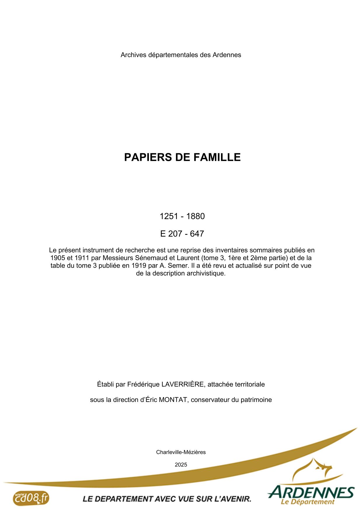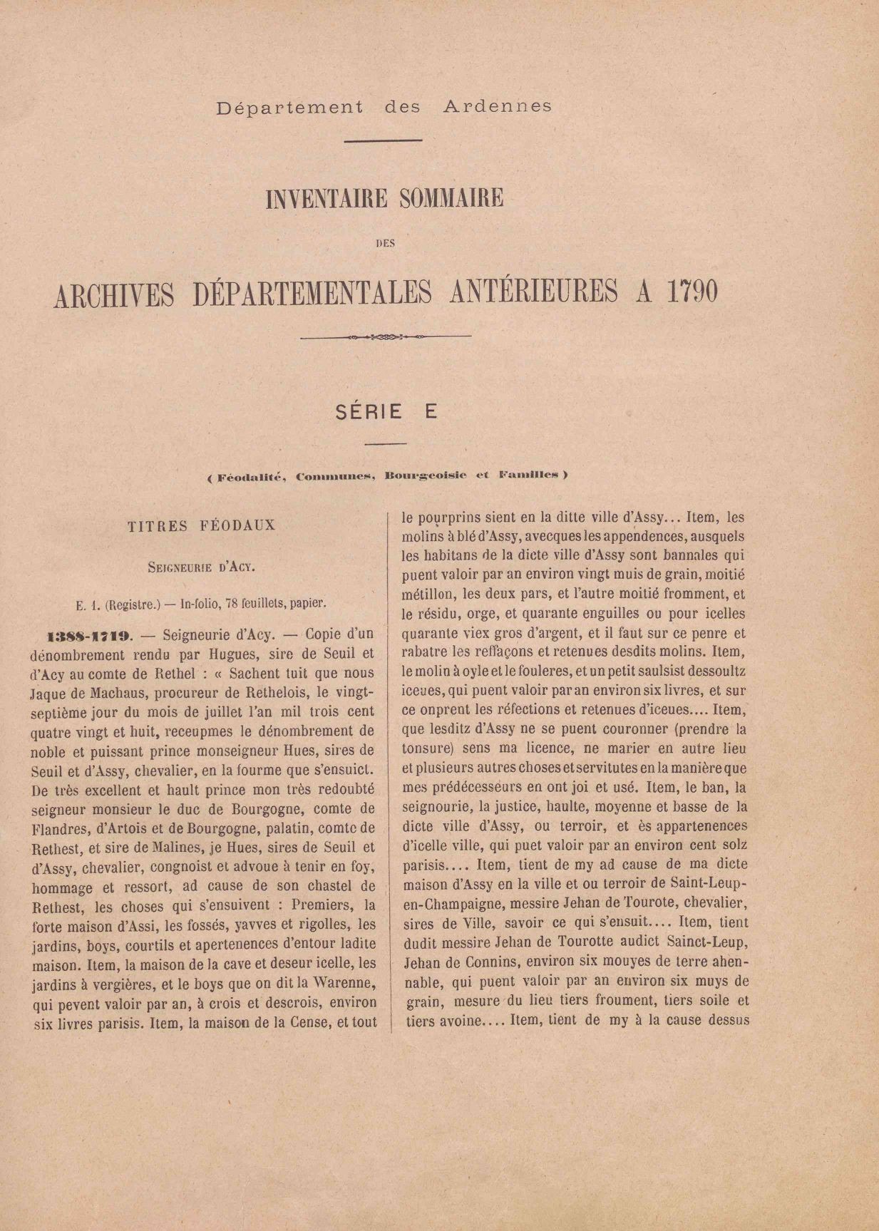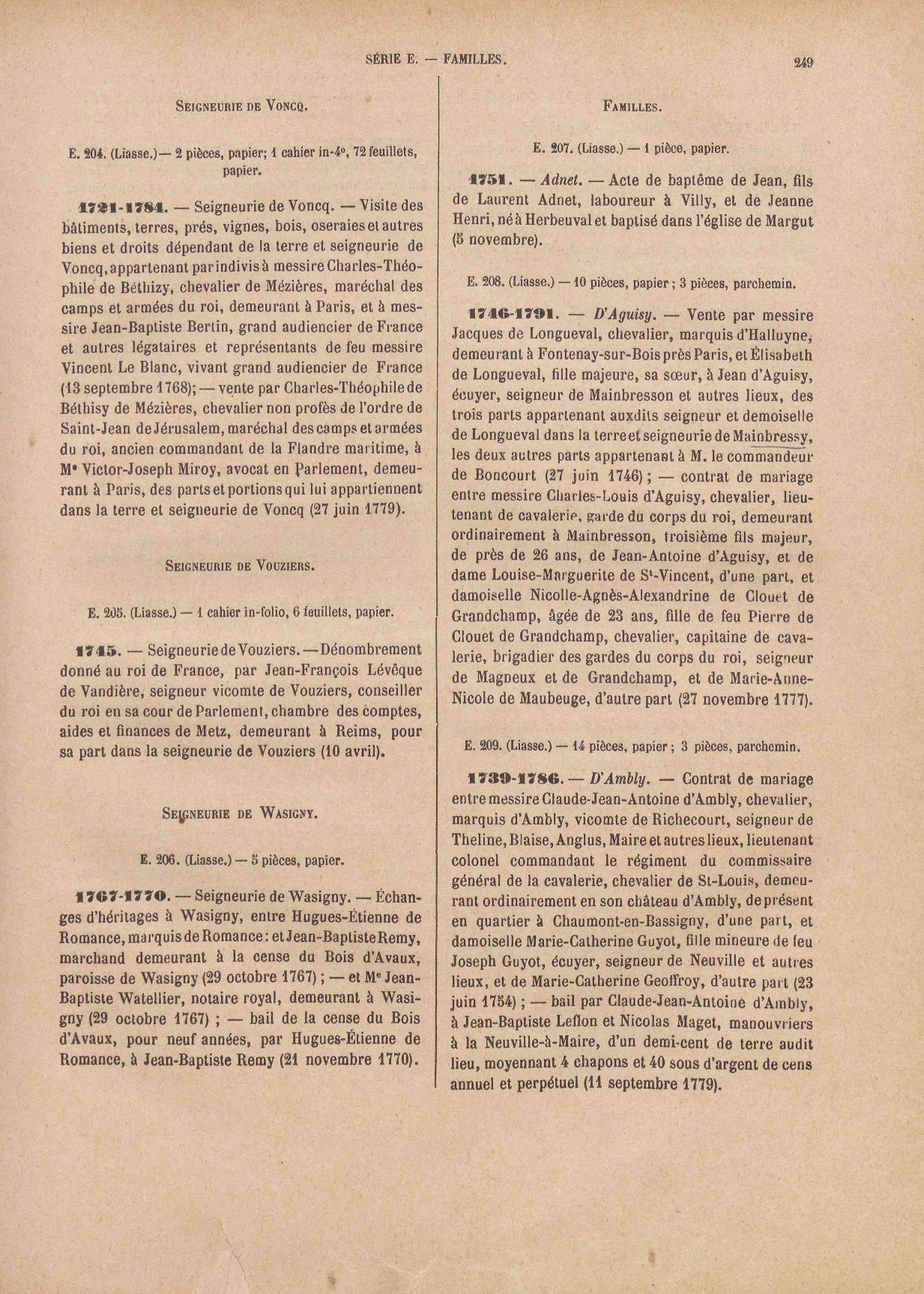 Seigneuries, familles Série E - Titres féodaux, seigneuries (231.3 Ko) Série E - Titres féodaux, seigneuries. Edition 1905 (47.0 Mo) Série E - Papiers de famille (700.1 Ko) Série E - Papiers de famille. Edition 1905 (36.8 Mo)