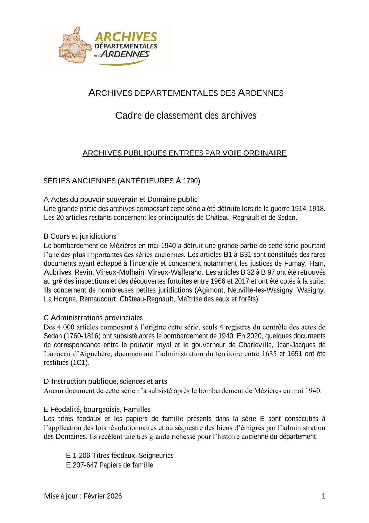 Le cadre de classement des Archives des Ardennes vous permettra de connaître la richesse des fonds conservés et les séries communes à toutes les Archives départementales.